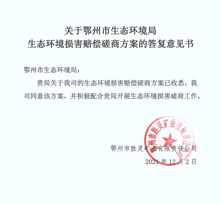 关于鄂州市生态环境局生态环境损害赔偿磋商方案的答复意见书
