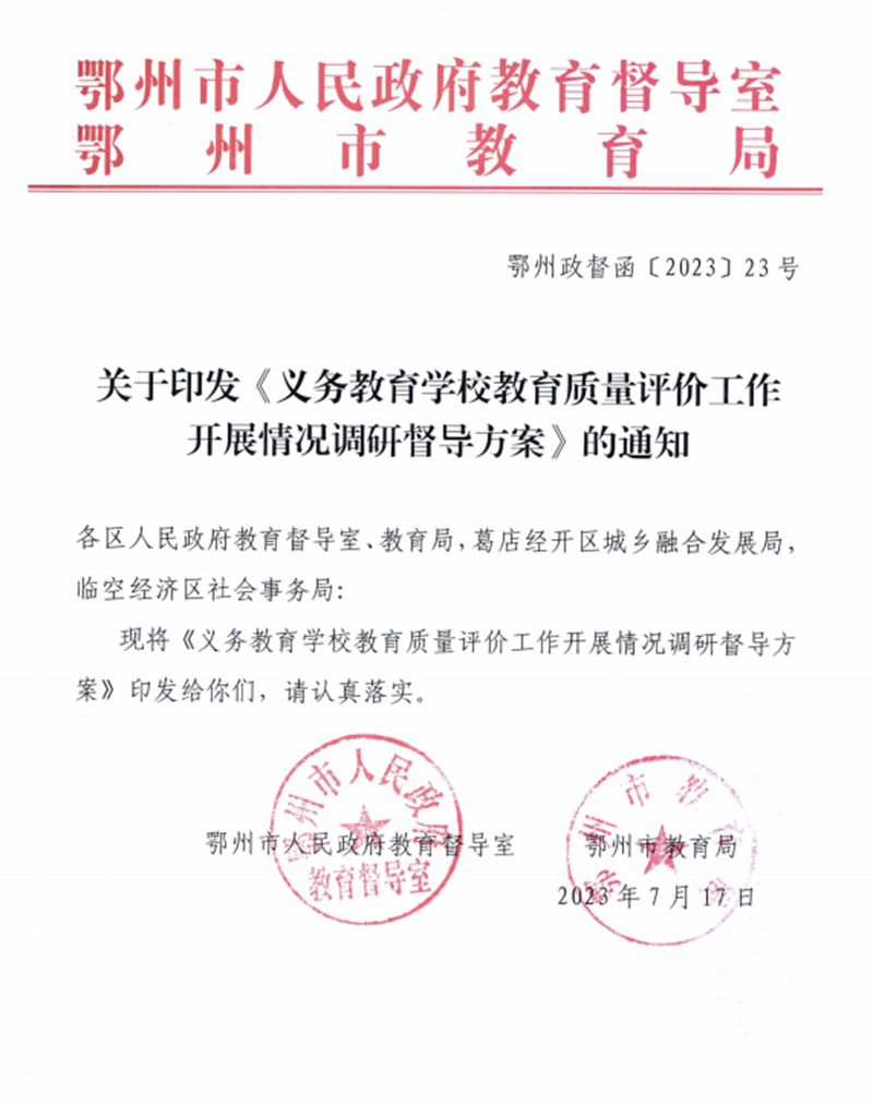 关于印发《义务教育学校教育质量评价工作开展情况调研督导方案》的通知