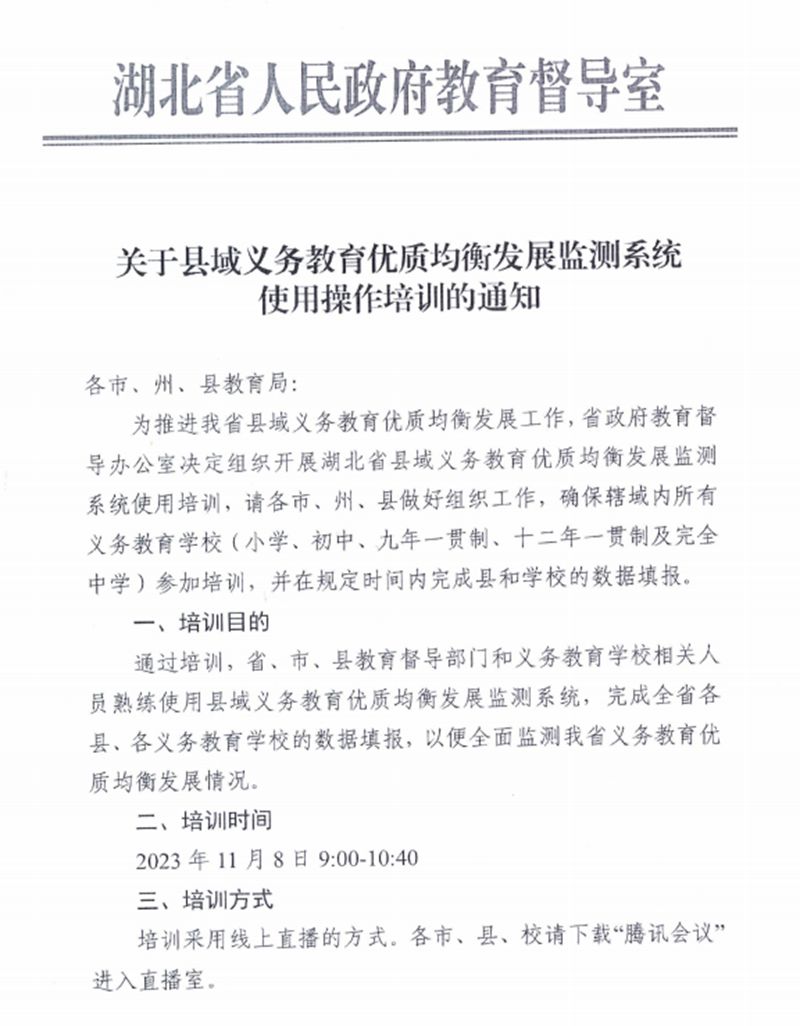 关于县域义务教育优质均衡发展监测系统使用操作培训的通知