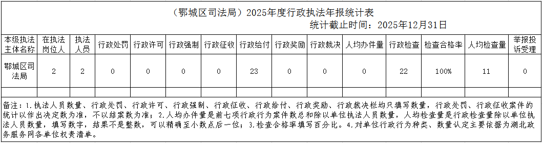 鄂城区司法局2025年度行政执法统计年报现予以公示,统计范围为2025年1月1日至12月31日。