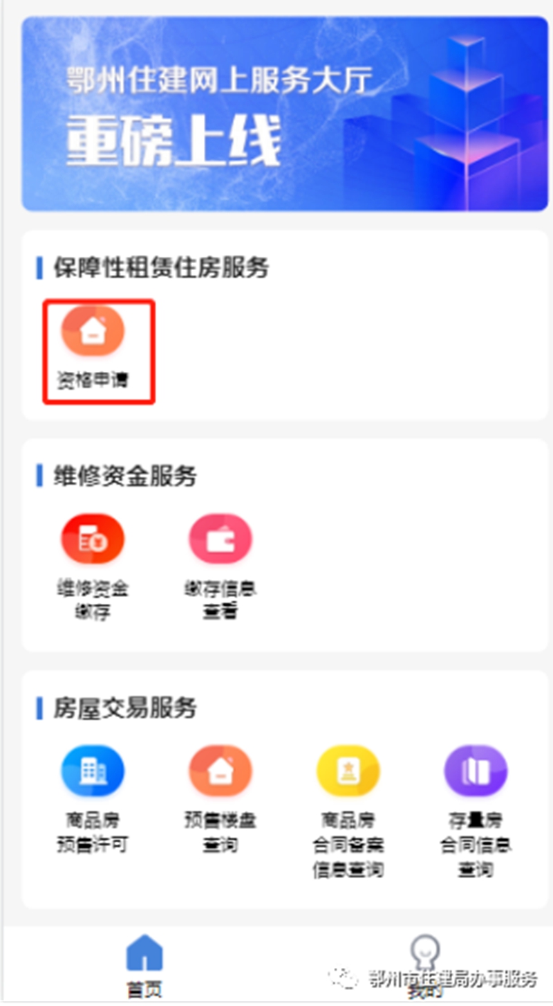 (一)关注“鄂州市住建局办事服务”公众号,点击进去,点击下方“办事服务”。