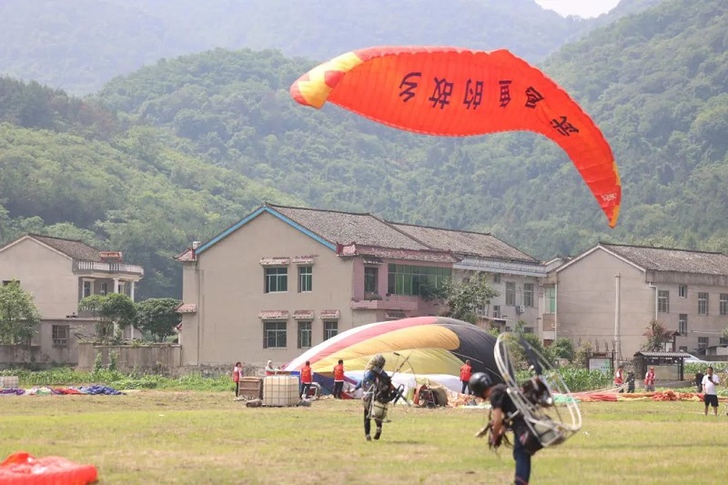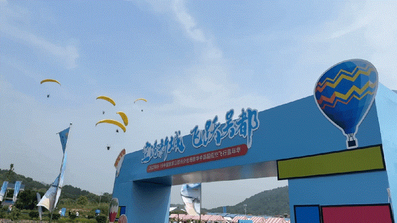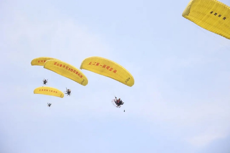 主舞台侧,发动机的轰鸣声响起,动力滑翔伞飞行器在空中拉出长长的尾迹云。