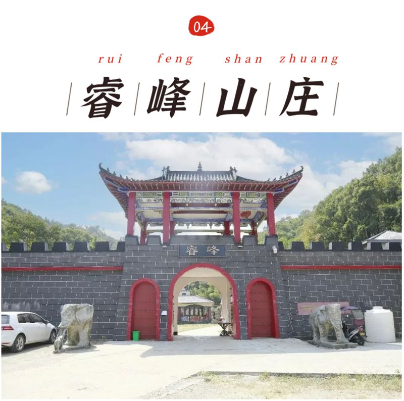 睿峰山庄位于汀祖镇岳石洪村,整个山庄位于东方山之东,建有一座七层高的白马塔,还有号称中国东方第一阶的520台阶、好汉坡、情人桥等景点。