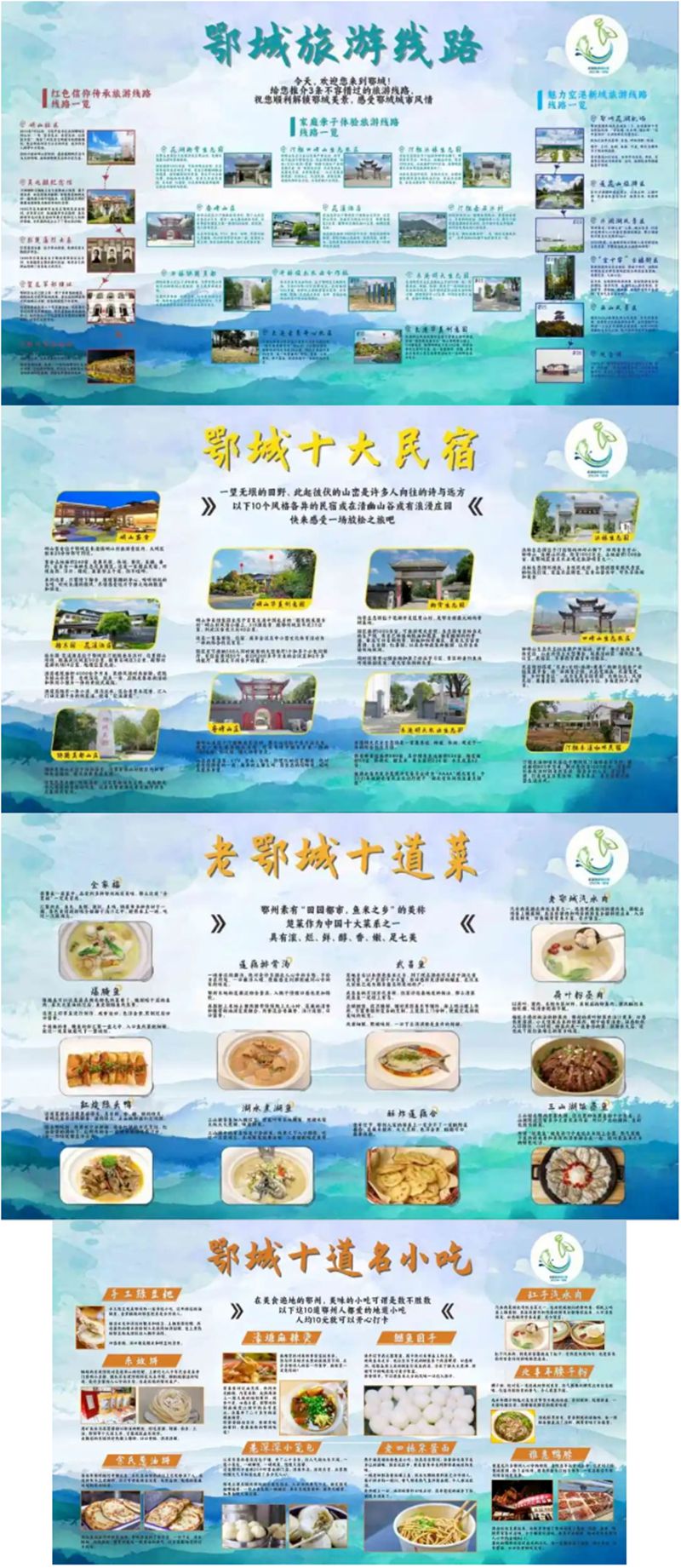 鄂城十大民宿、鄂城十道名小吃,一系列展板展现了鄂城的文旅魅力,也向代表团们发出邀约:“欢迎到鄂城各处看一看,转一转,尽情品味吴都风采!”