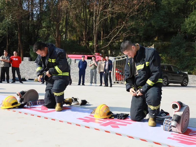 “计时开始!”随着发令枪响起,比赛正式开始。本场比武共设置了三个比拼项目,分别是原地着灭火战斗服、两人两盘水带连接、灭火器油桶灭火。前期,全区10个乡镇、街道自行组织了预赛,挑选出了各自最强选手来到决战赛场。