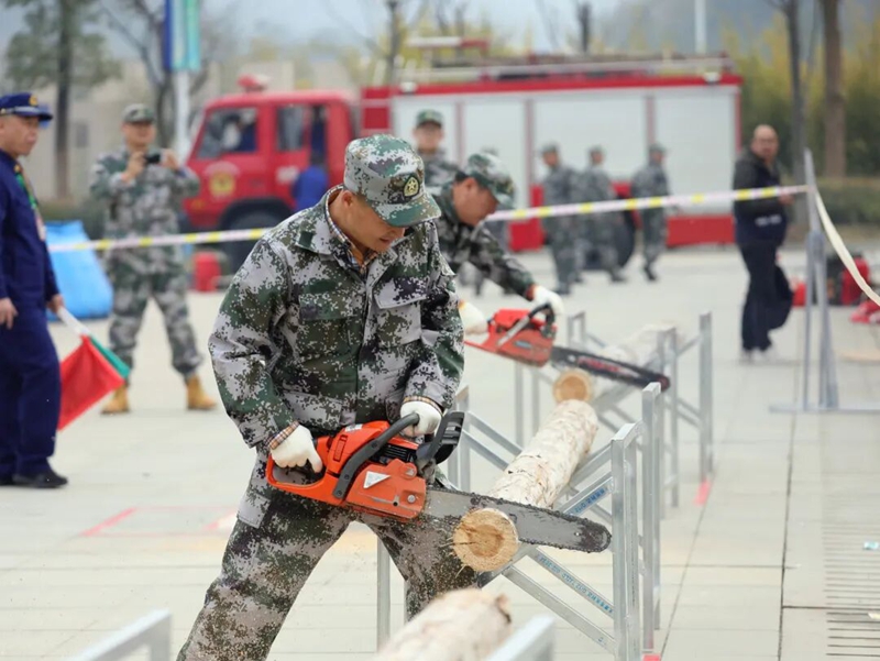 竞赛聚焦实战需求,设置负重越野、灭火装备综合操、水泵接力操三大核心项目,既考验队员体能耐力,又锤炼装备操作、团队协作等专业技能。负重越野赛道上,队员们背负风力灭火机、水带等装备,在400米赛程中奋勇争先;灭火装备综合操环节,选手们熟练运用风力灭火机、电动水枪、油锯等器材,精准完成模拟火线扑打、射水储水、圆木切割等操作;水泵接力操现场,各队8名队员协同配合,快速铺设120米水带,实现远距离精准供水命中目标,展现了高效的团队协作能力。