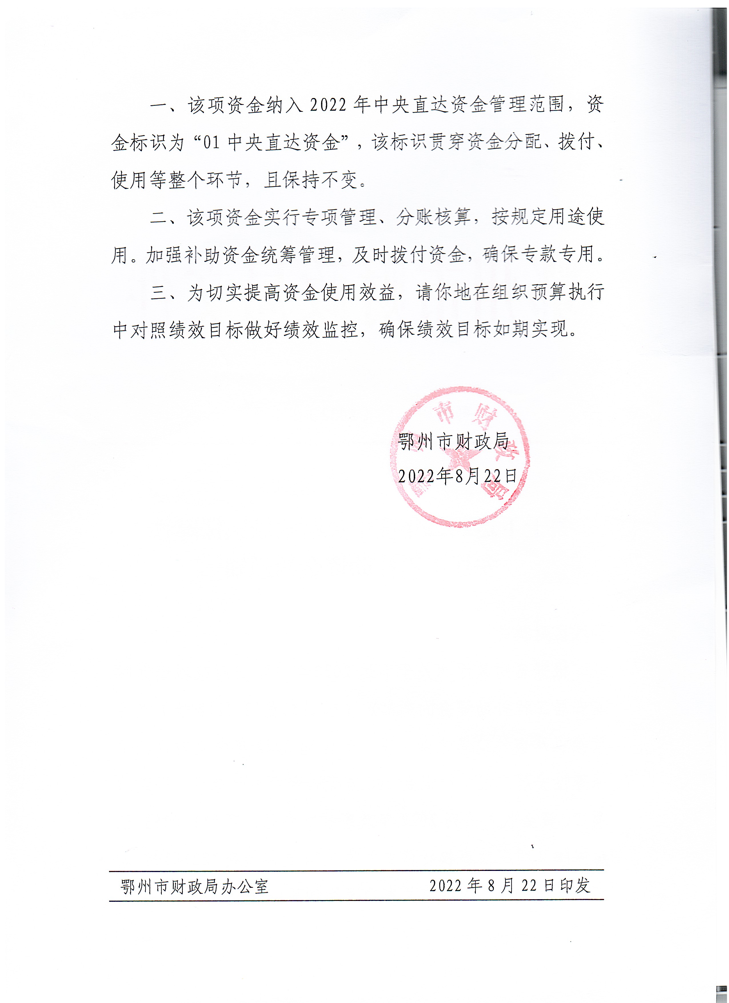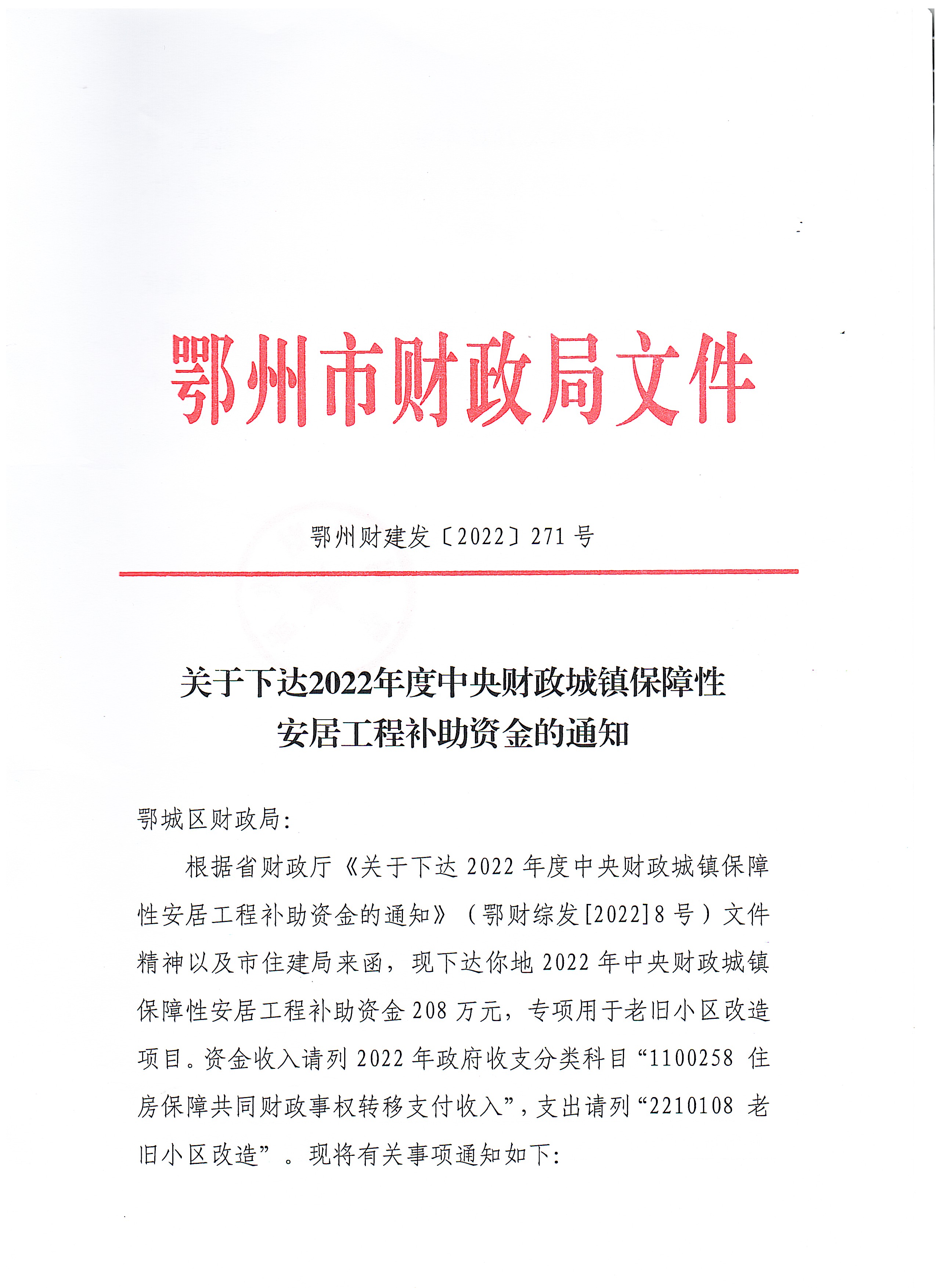根据《2022年中央财政城镇保障性安居工程补助资金》(鄂州财建发[2022]271号)精神,经区委区政府同意,现就提前下达预算指标有关事项通知见附件。