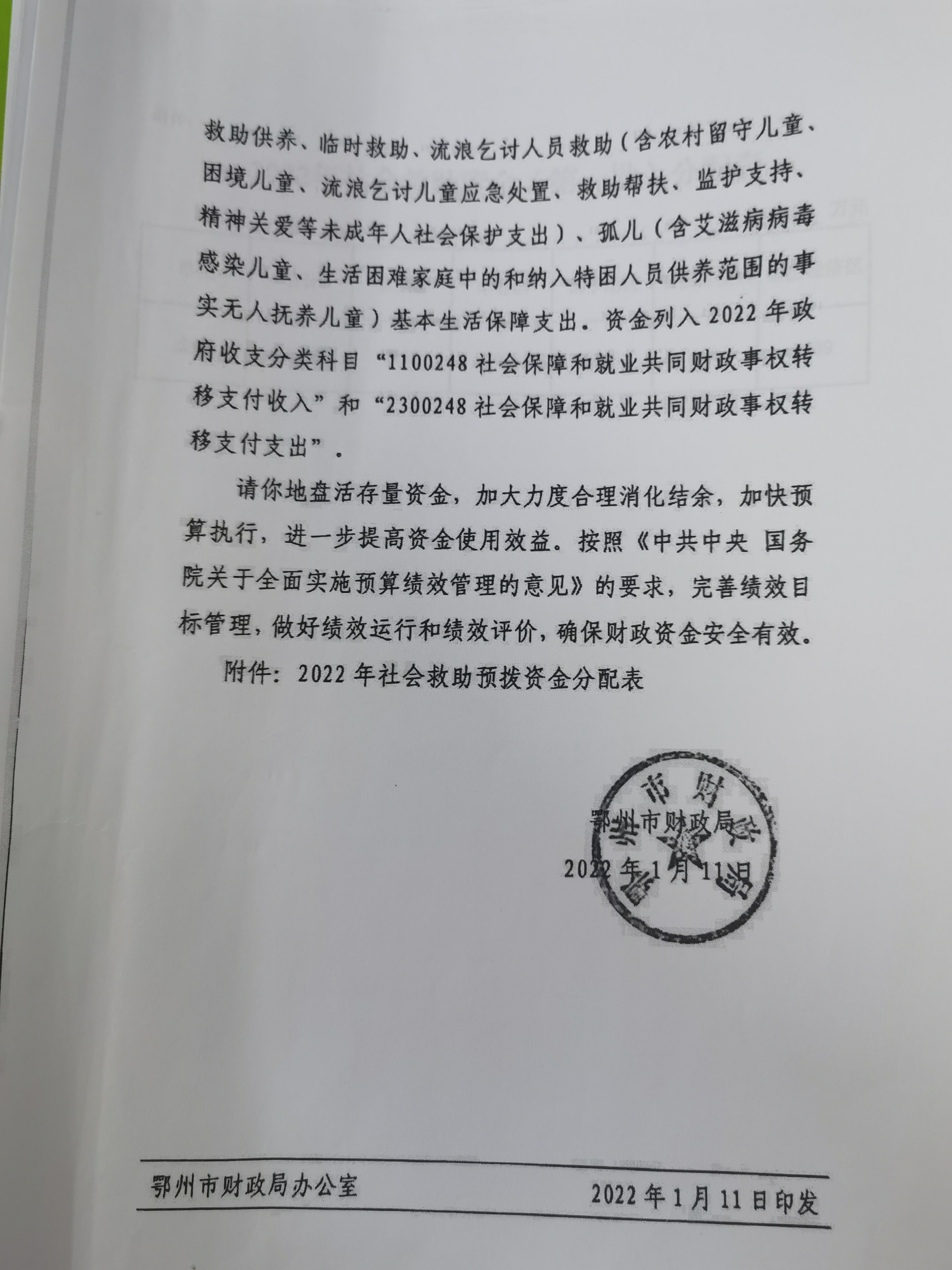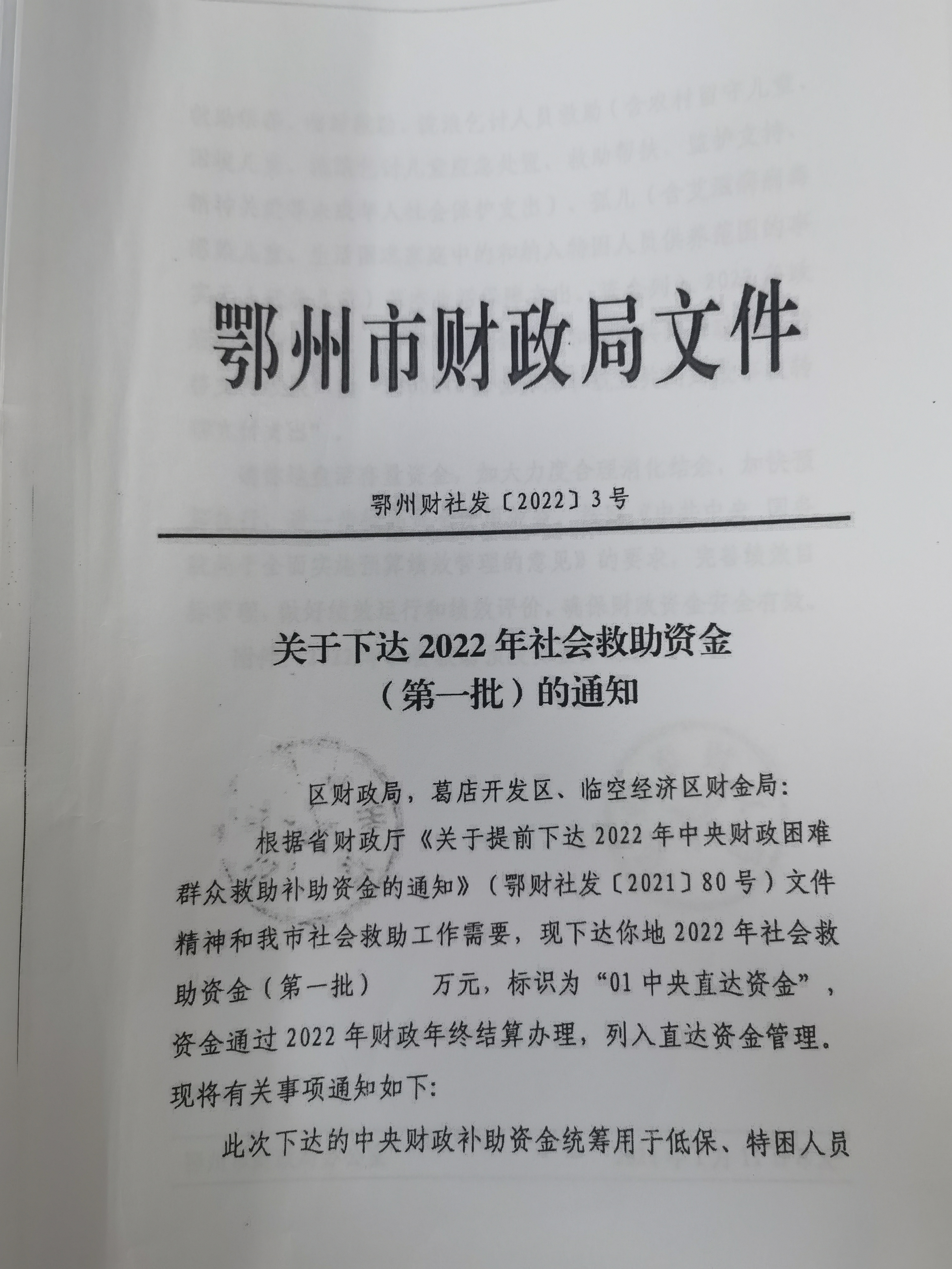 根据《2022年社会救助资金(第一批)》(鄂州财社发[2022]3号)精神,经区委区政府同意,现就提前下达预算指标有关事项通知见附件。