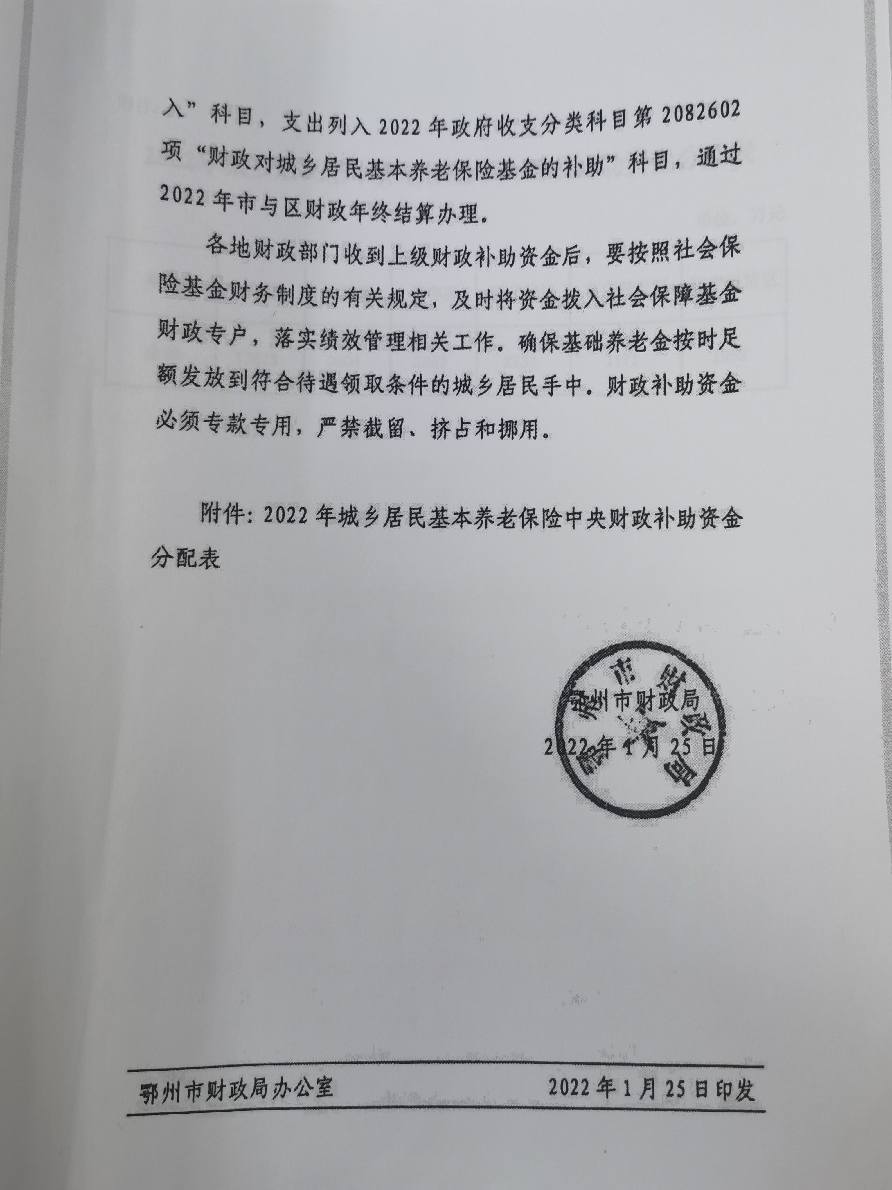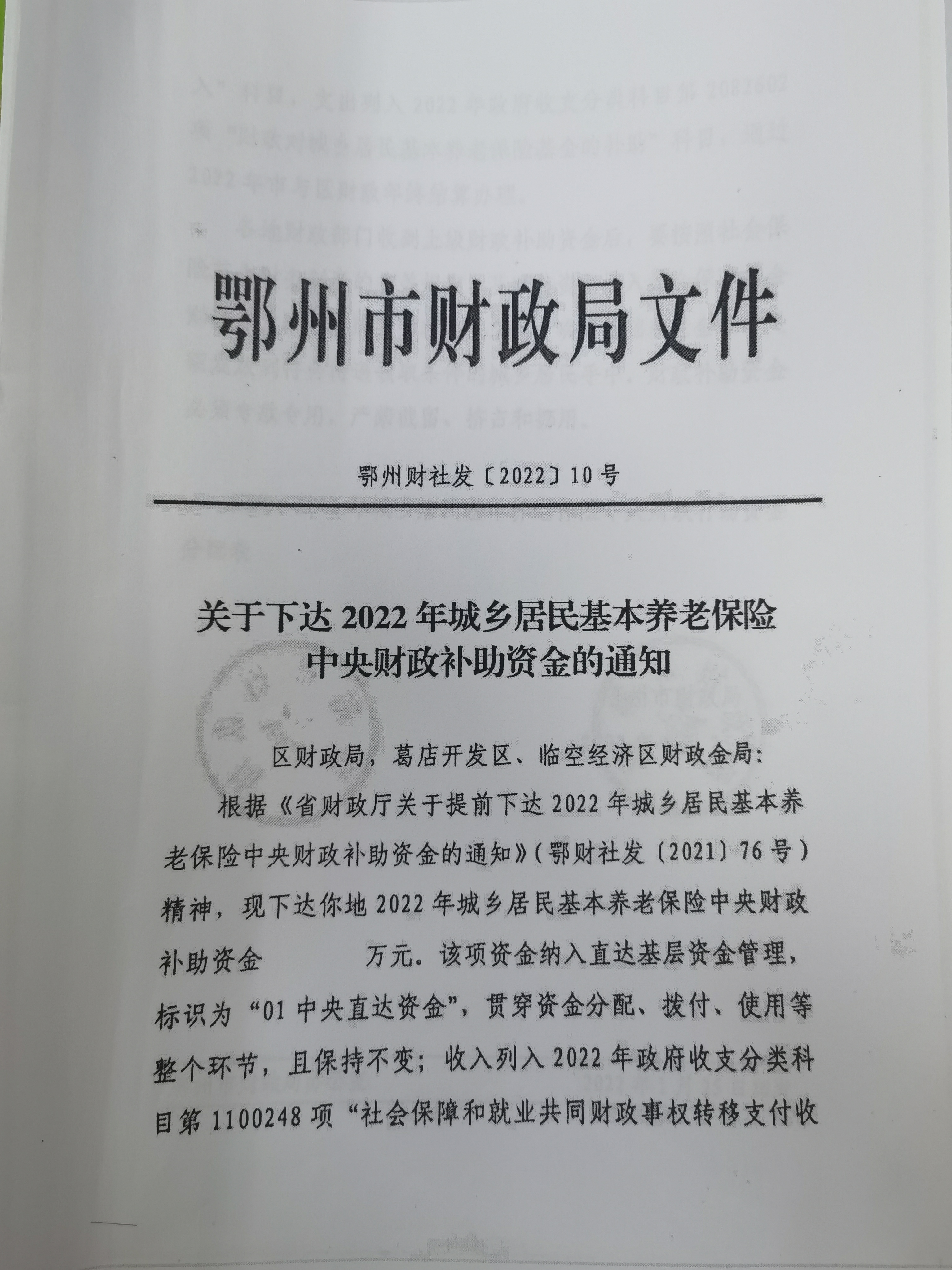 根据《2022年城乡居民基本养老保险中央财政补助资金》(鄂州财社发[2022]10号)精神,经区委区政府同意,现就提前下达预算指标有关事项通知见附件。