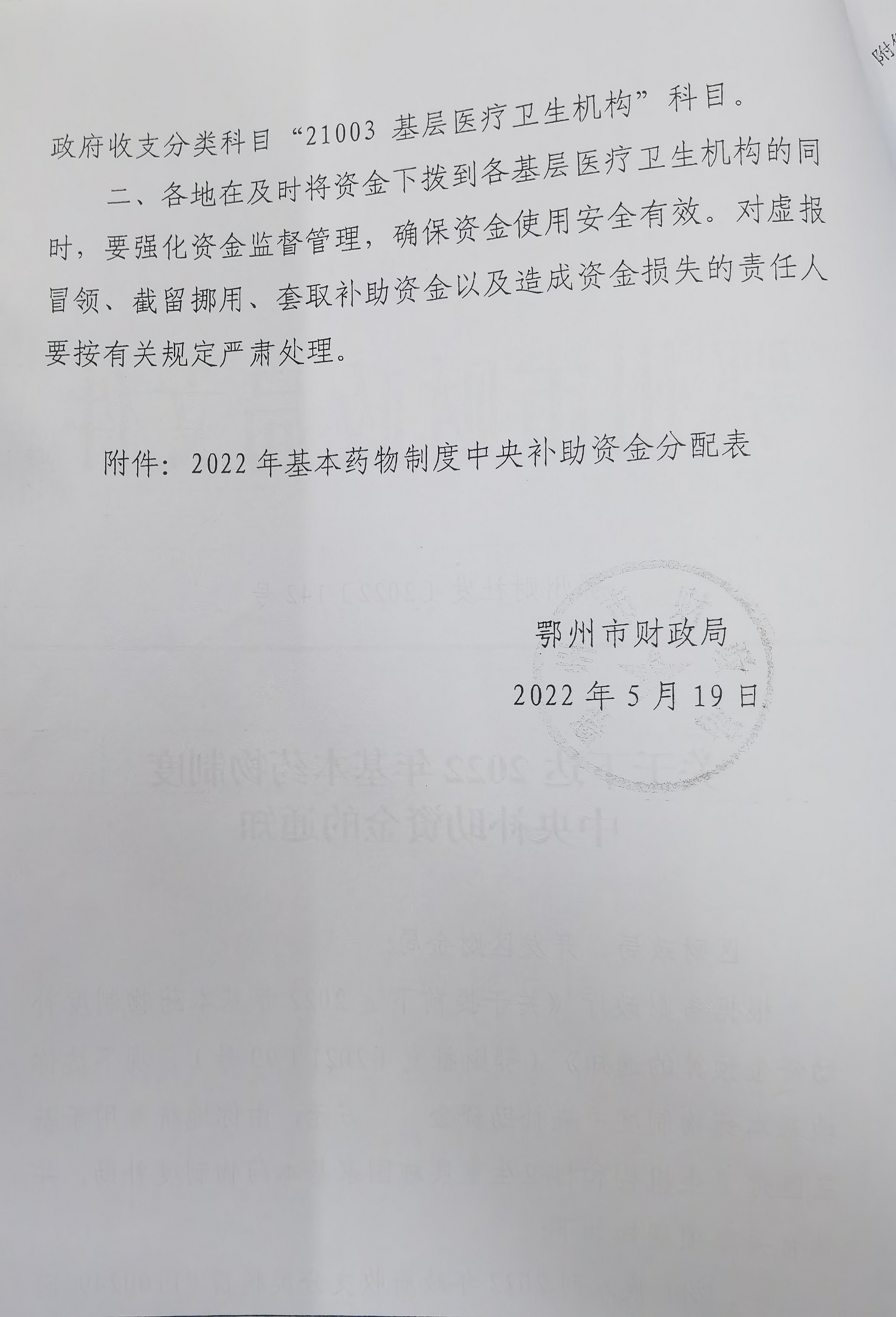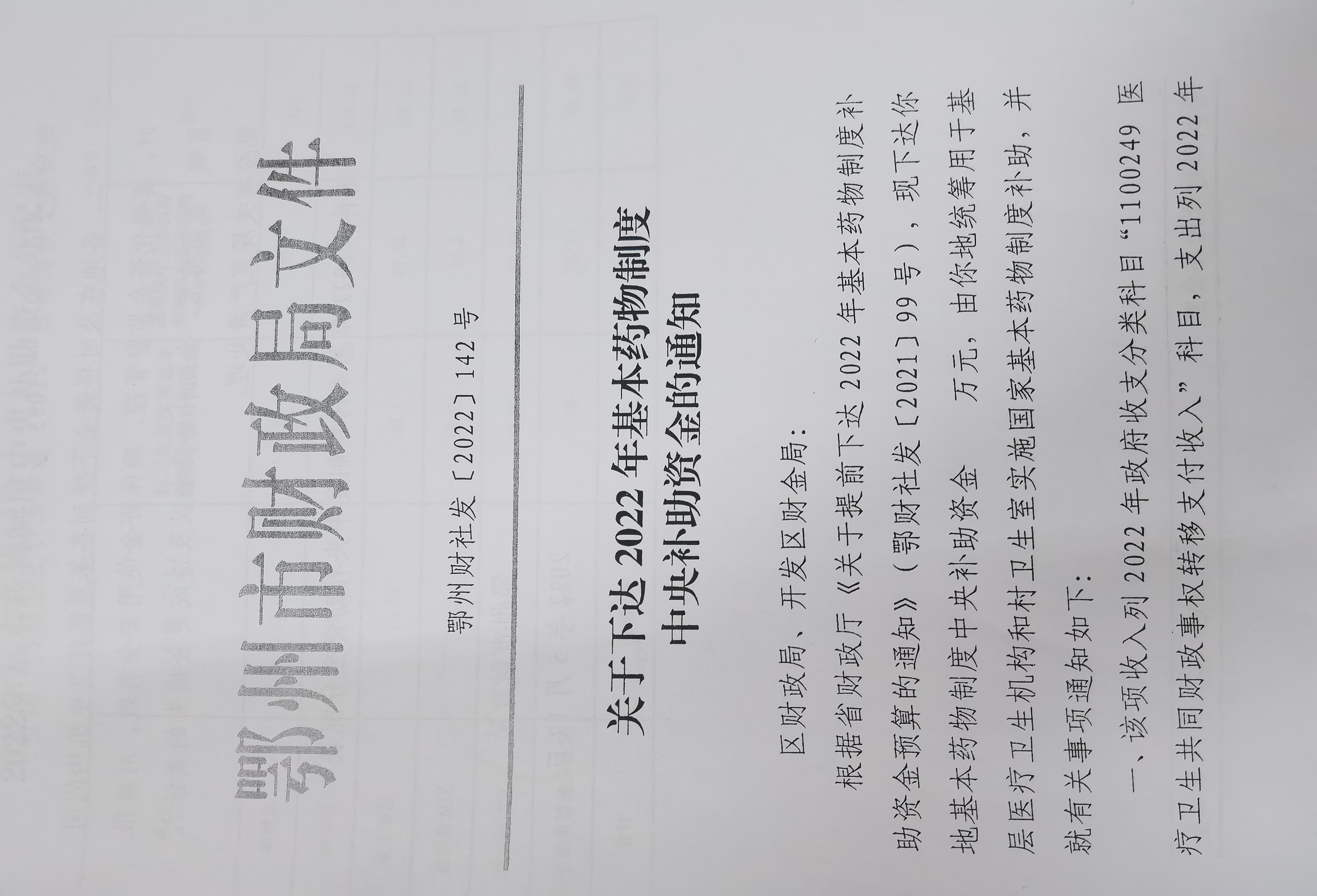 根据《2022年基本药物制度中央补助资金》(鄂州财社发[2022]142号)精神,经区委区政府同意,现就提前下达预算指标有关事项通知见附件。