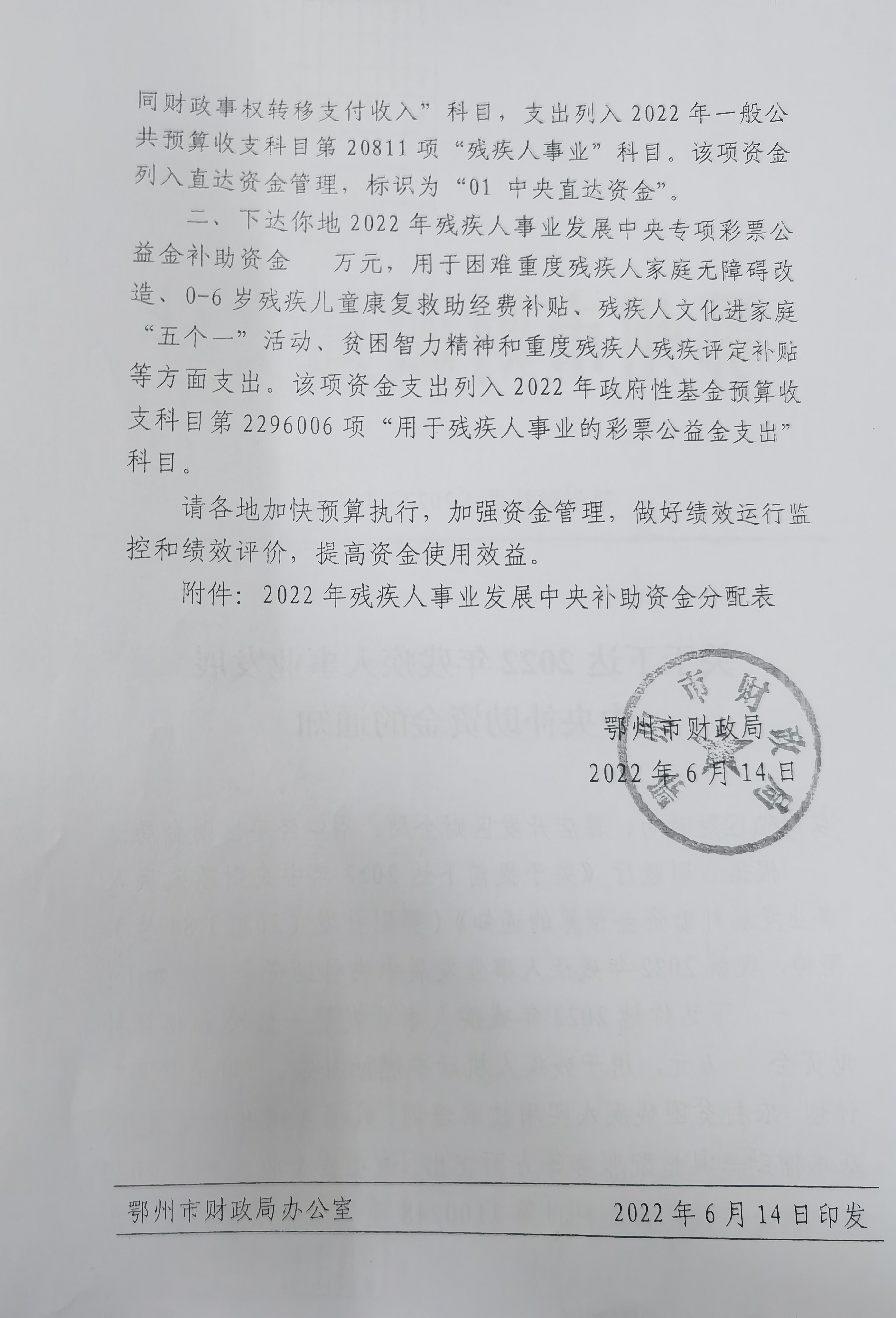根据《2022年残疾人事业发展中央补助资金》(鄂州财社发[2022]164号)精神,经区委区政府同意,现就提前下达预算指标有关事项通知见附件。