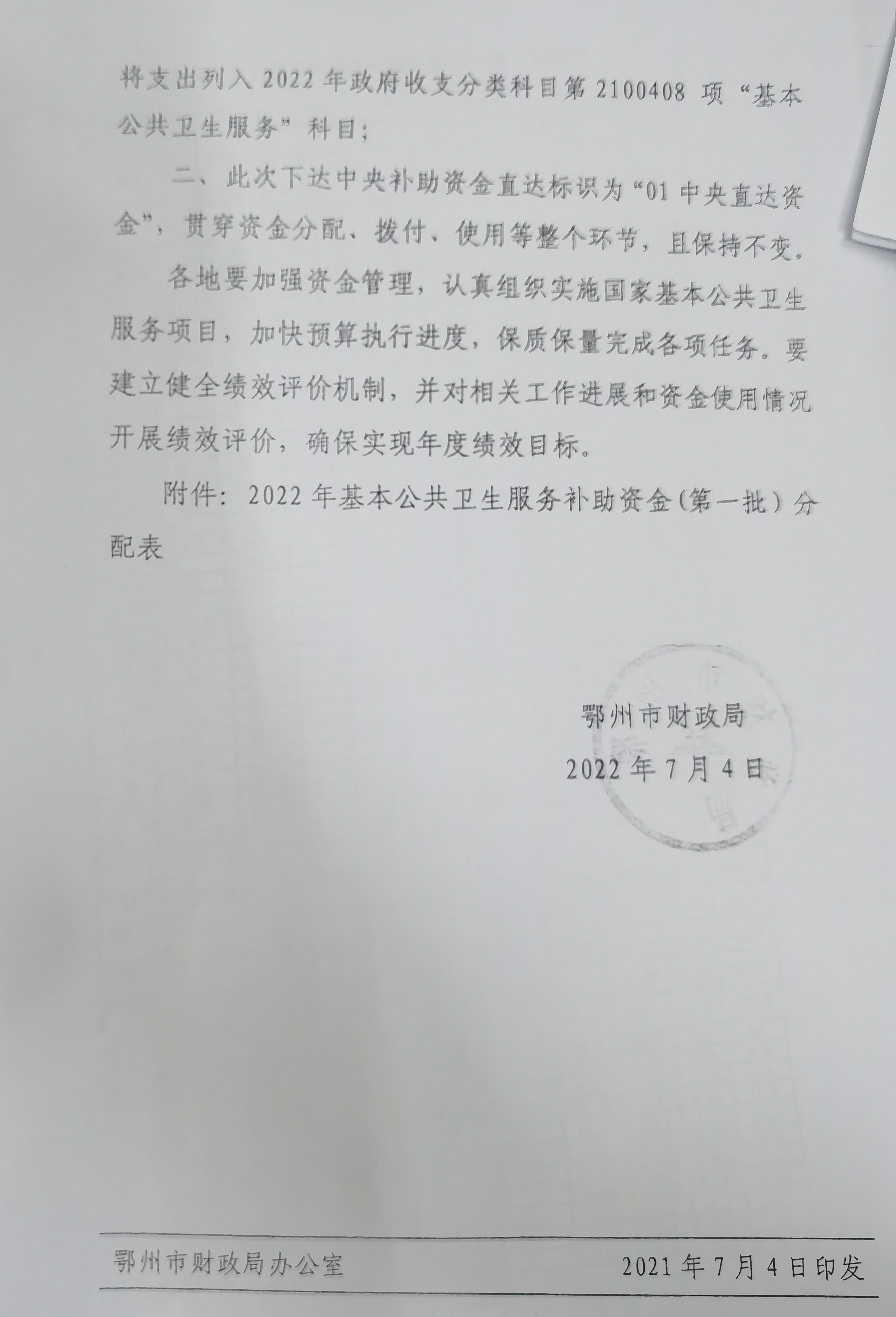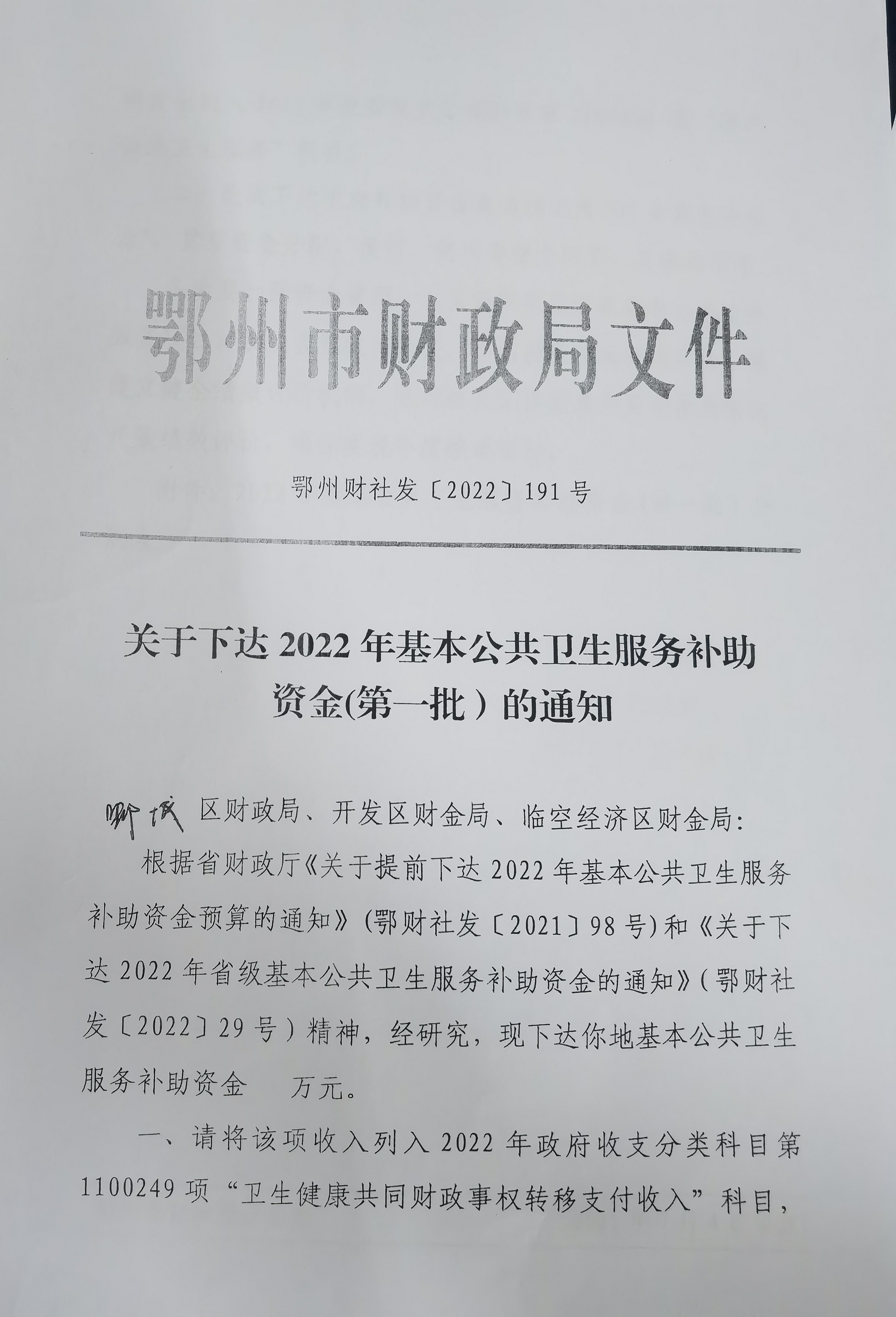 根据《2022年基本公共卫生服务补助资金》(鄂州财社发[2022]191号)精神,经区委区政府同意,现就提前下达预算指标有关事项通知见附件。