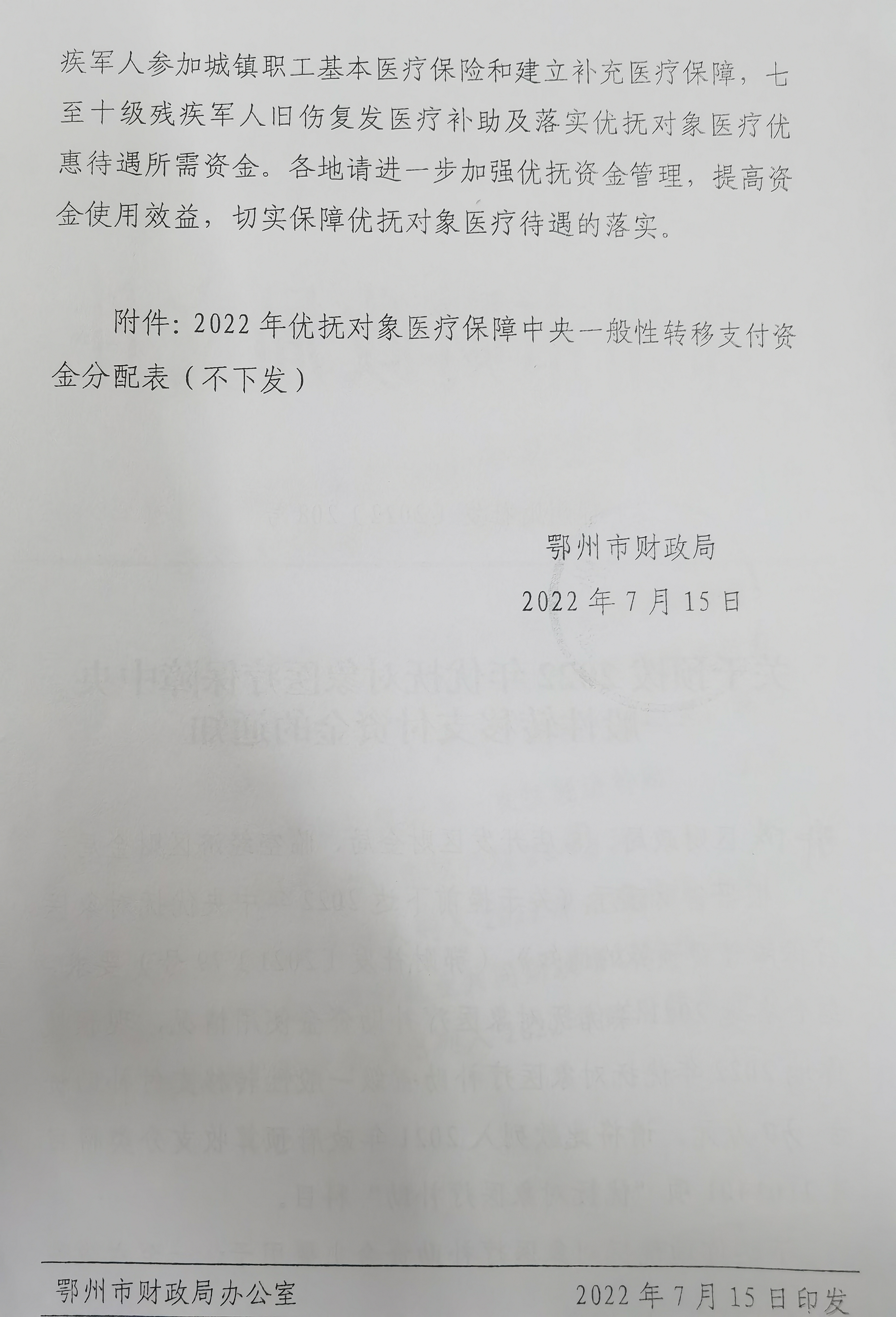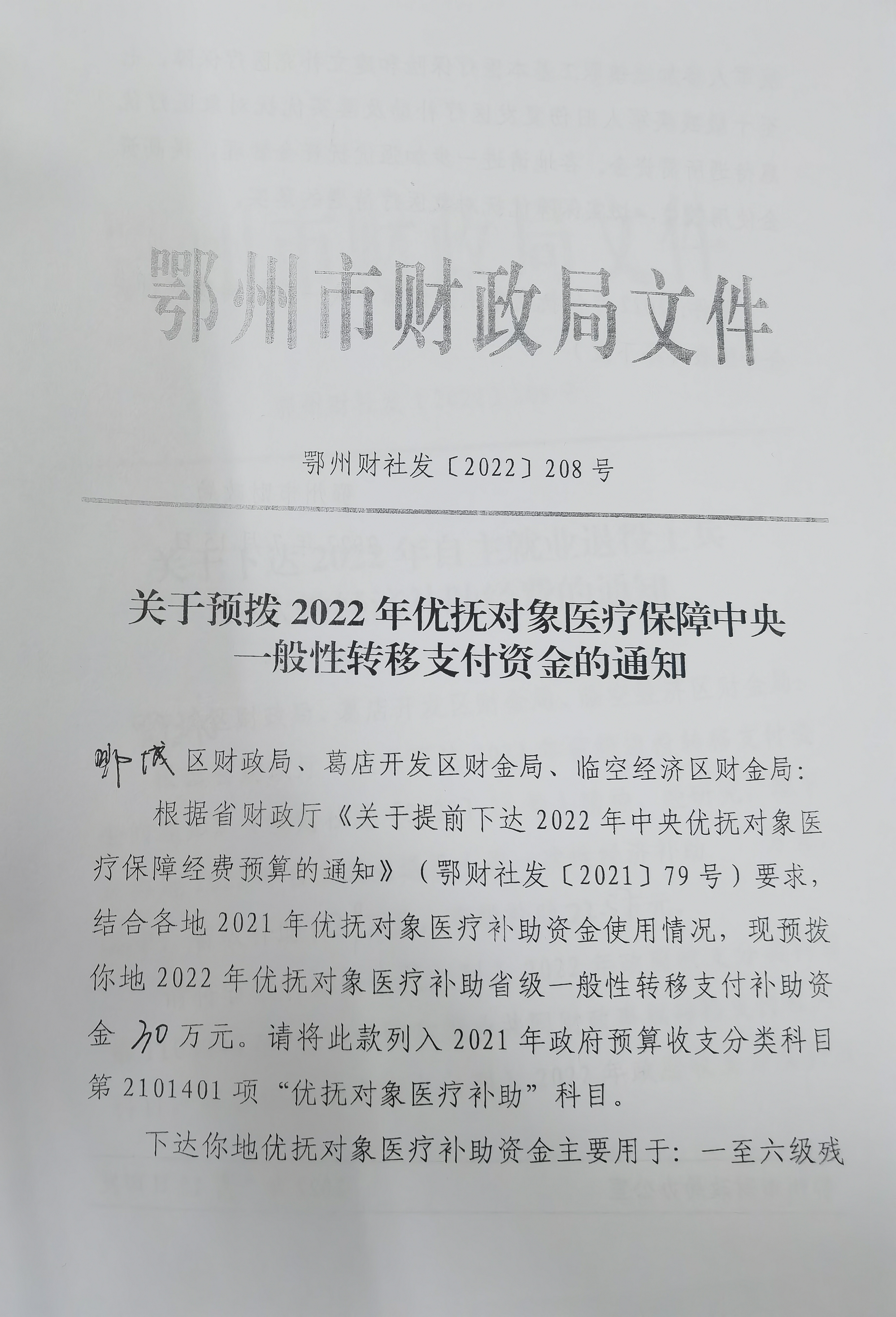 根据《2022年优抚对象医疗保障中央一般性转移支付资金》(鄂州财社发[2022]208号)精神,经区委区政府同意,现就提前下达预算指标有关事项通知见附件。