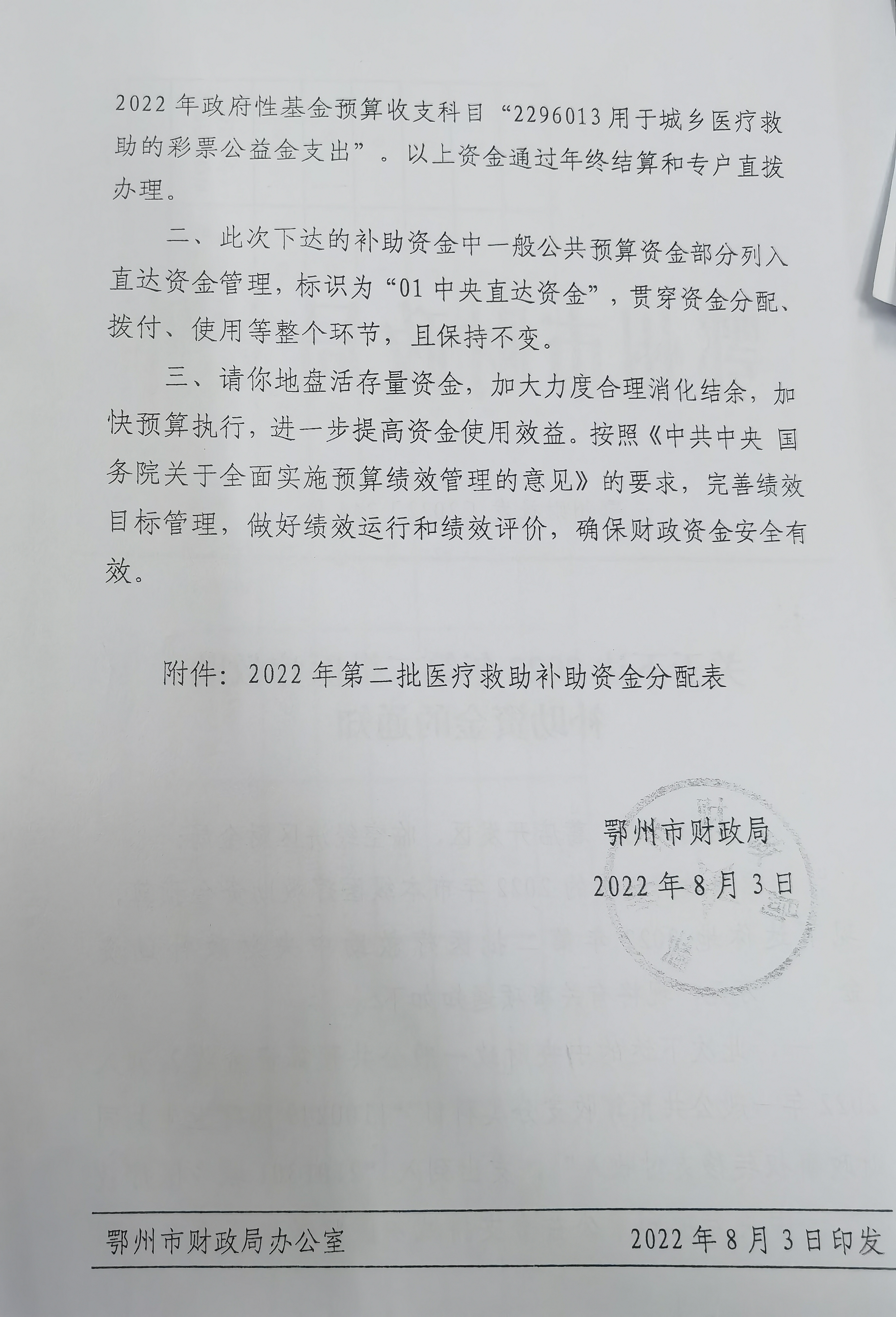 根据《2022年第二批医疗救助补助资金》(鄂州财社发[2022]244号)精神,经区委区政府同意,现就提前下达预算指标有关事项通知见附件。