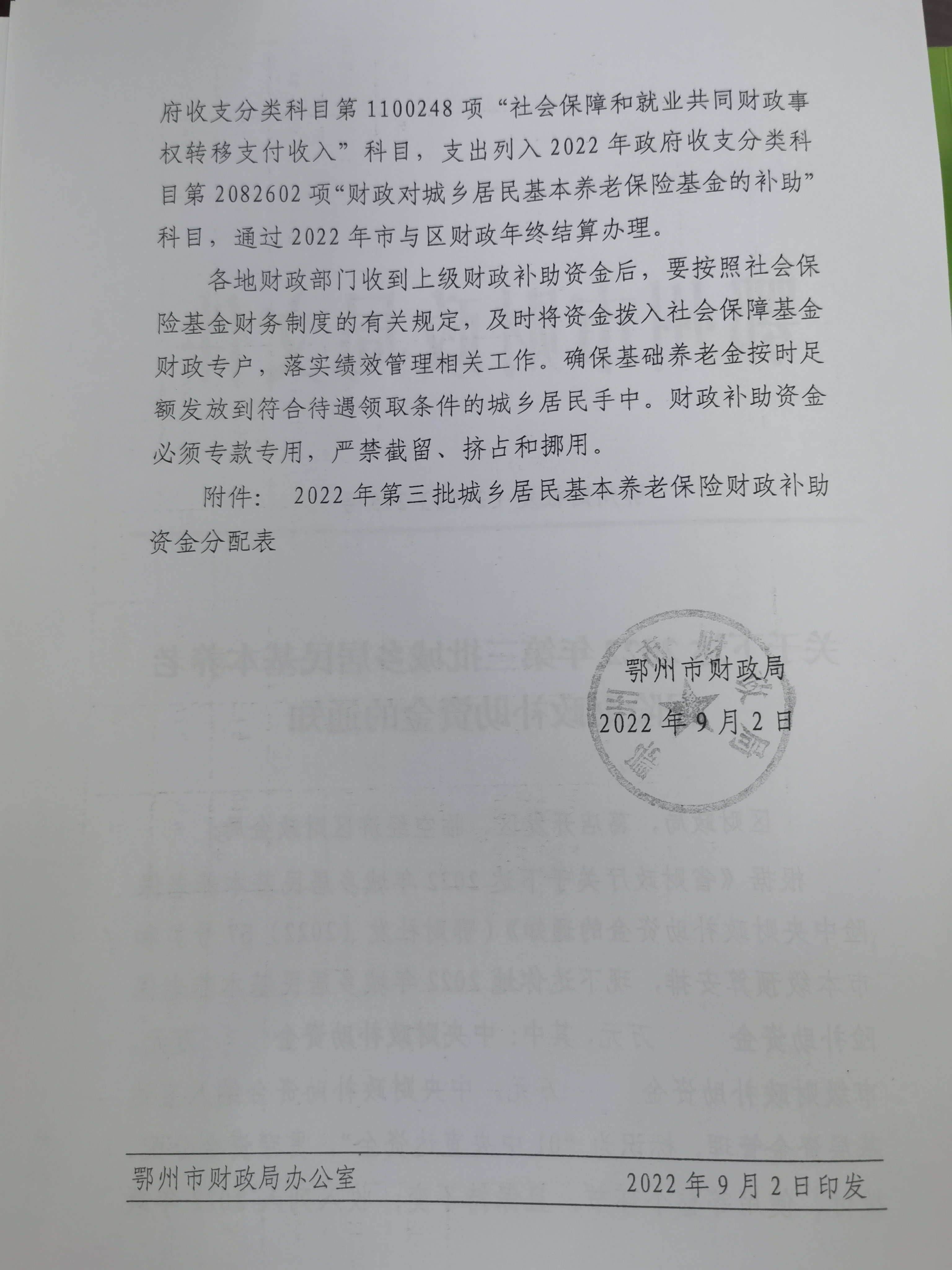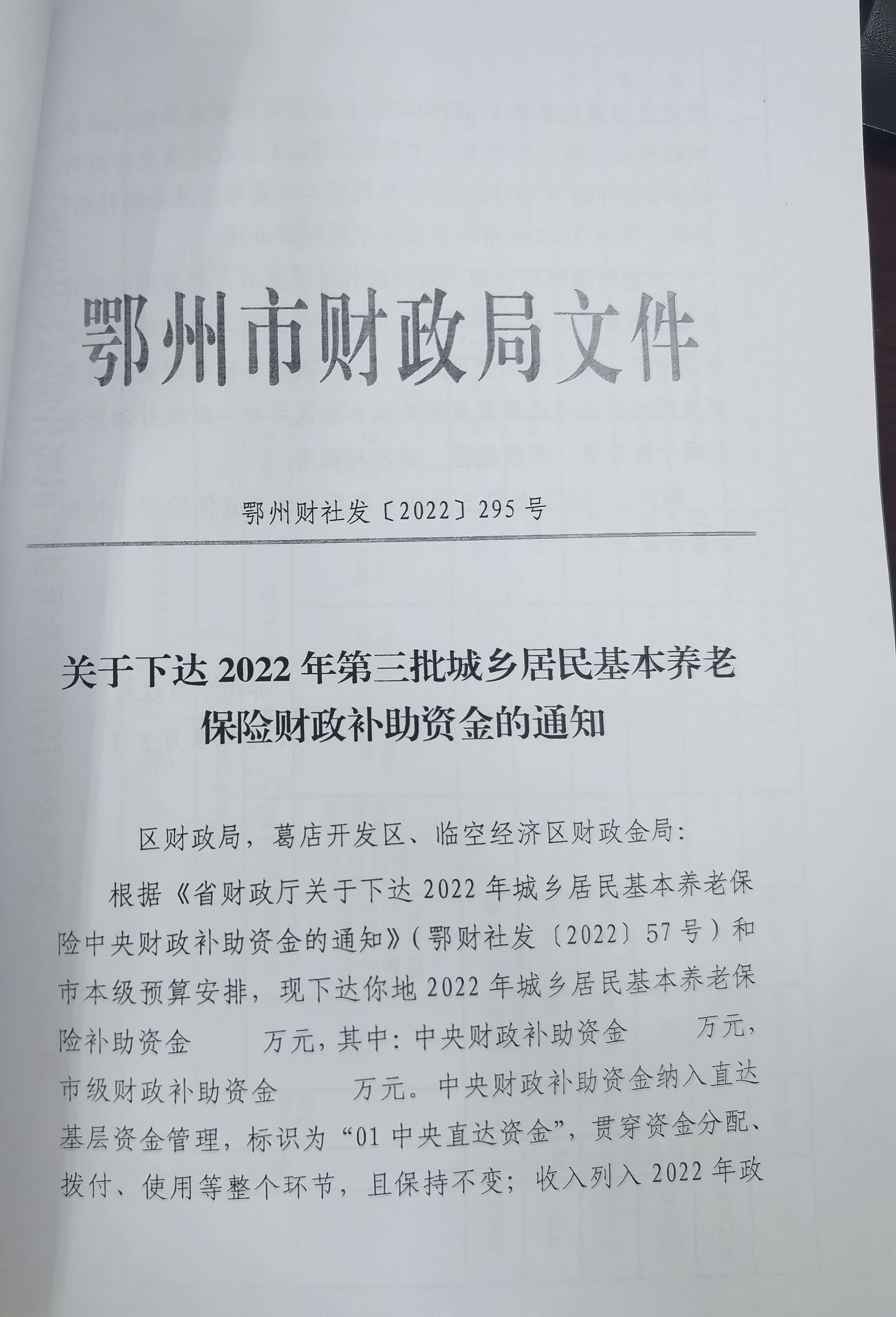 根据《2022年第三批城乡居民基本养老保险财政补助资金》(鄂州财社发[2022]295号)精神,经区委区政府同意,现就提前下达预算指标有关事项通知见附件。