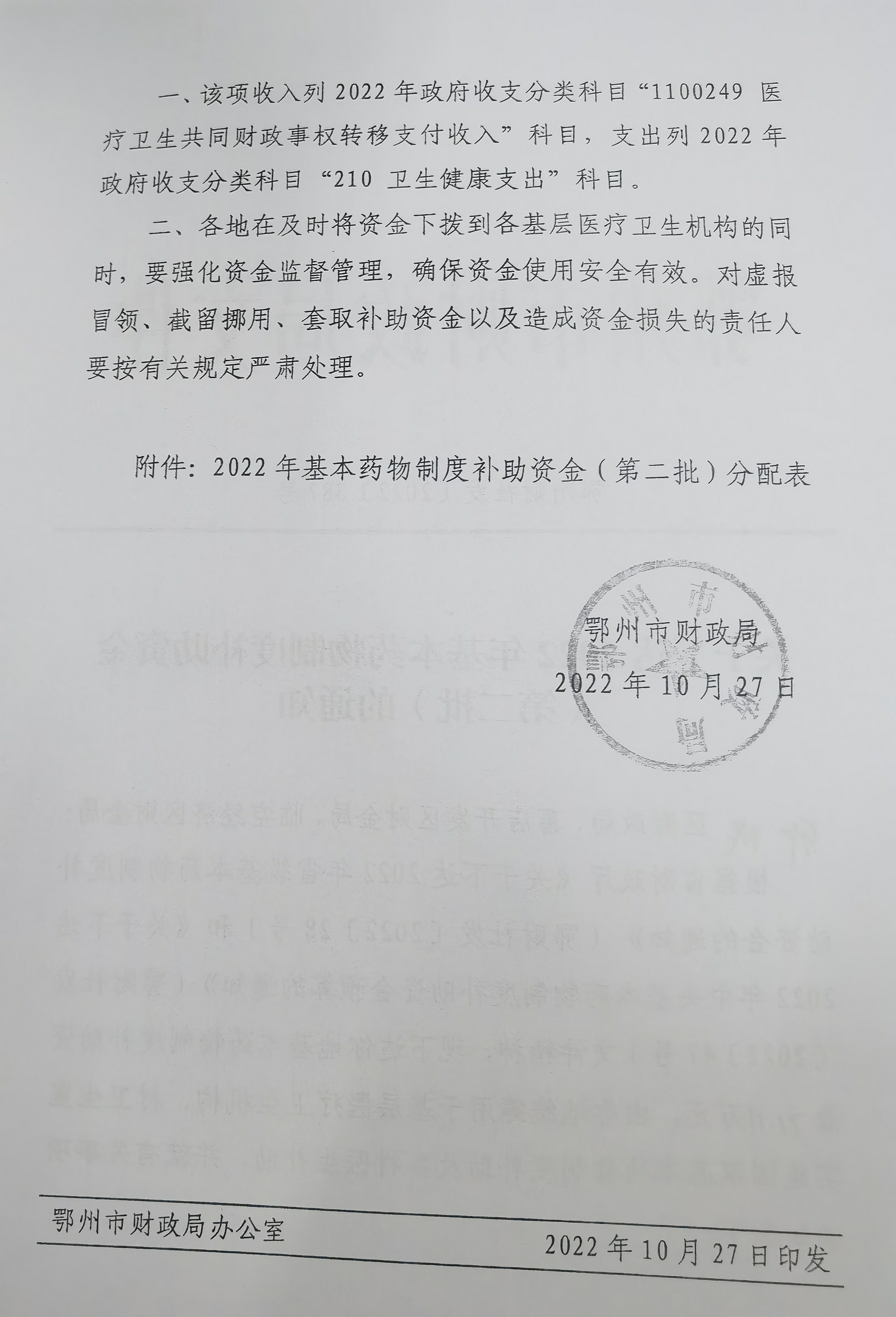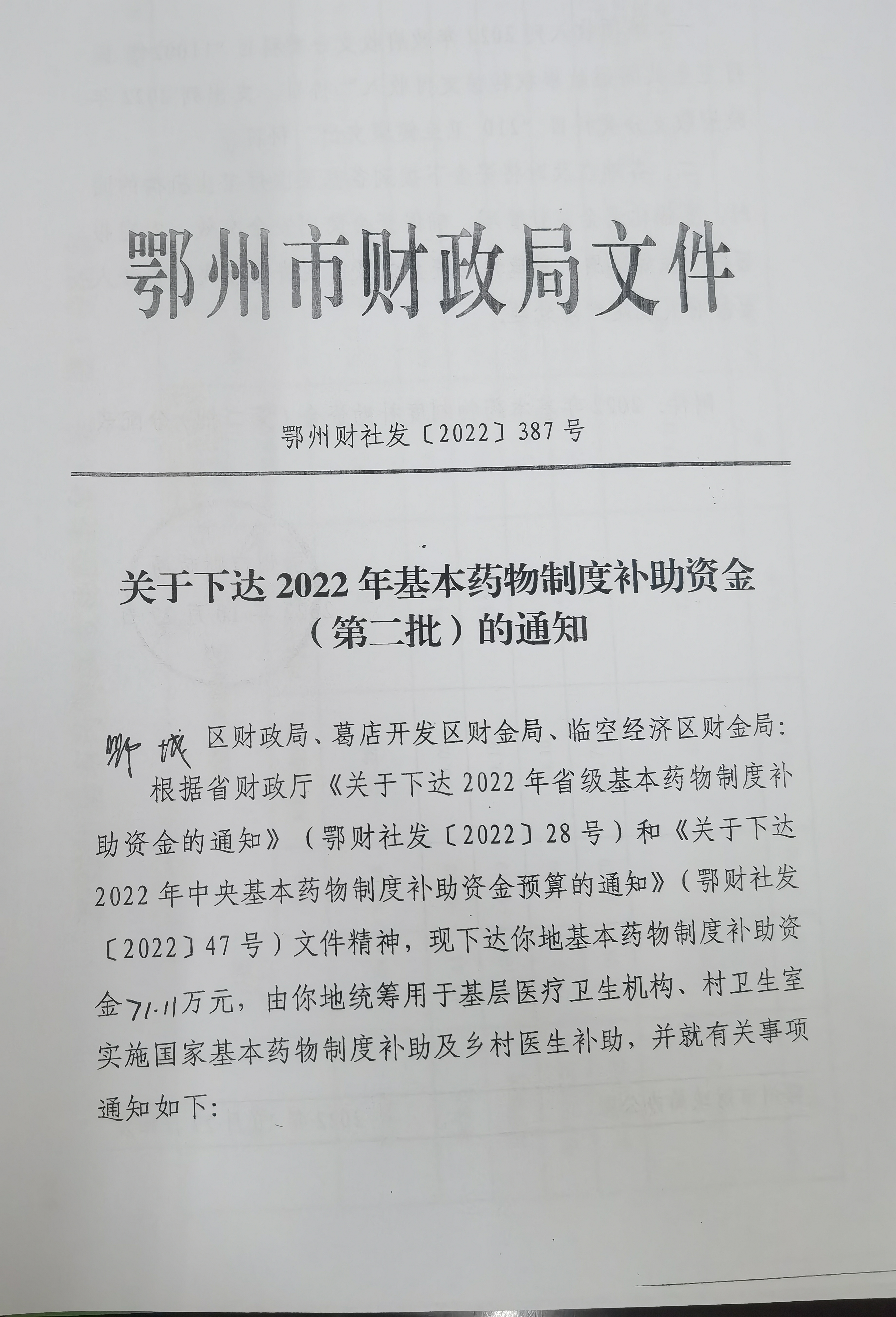 根据《2022年基本药物制度补助资金(第二批)》(鄂州财社发[2022]387号)精神,经区委区政府同意,现就提前下达预算指标有关事项通知见附件。