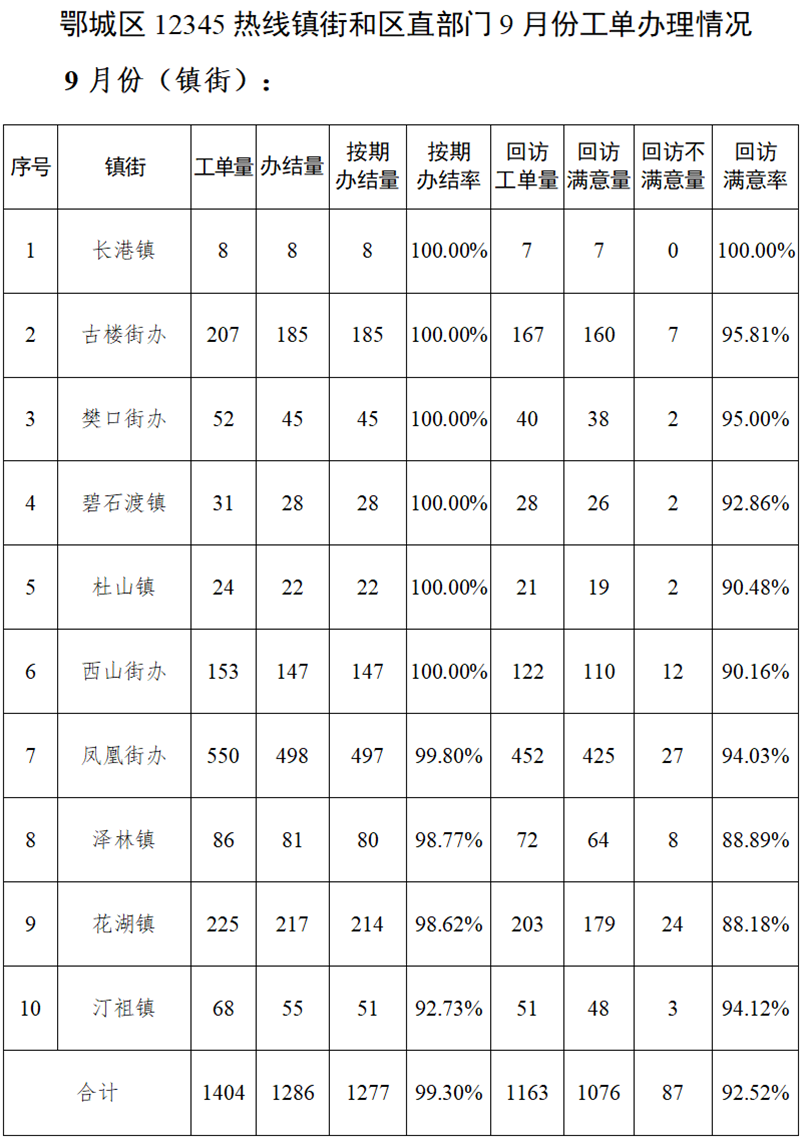 2024年以来,鄂城区认真践行以人民为中心的发展思想,依托市级12345服务热线,建立“接、派、办、督、评、用”的“民呼我应、接诉即办”工作体系,聚力解决企业、群众诉求和急难愁盼问题,进一步打通服务群众“最后一百米”,助力推动基层治理体系和治理能力现代化。现将9月份12345服务热线办理情况通报如下:
