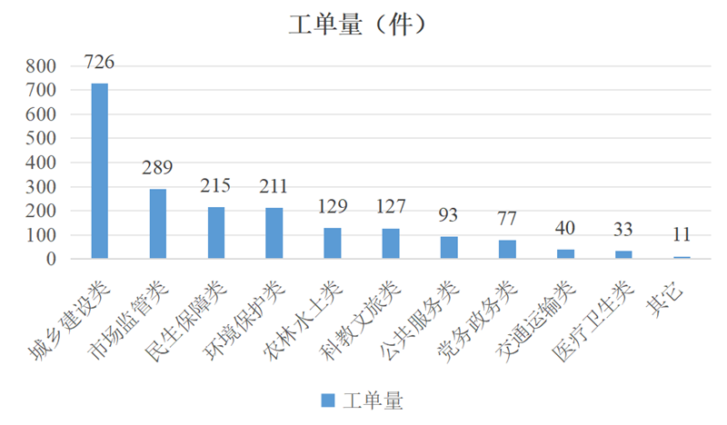 2026年3月份(截至3月31日),全区共接收市12345热线交办和转办工单1951件。按照内容划分,城乡建设类问题共726件,占工单量的37.2%,较上期上升5.4个百分点;市场监管类问题共289件,占工单量的14.8%,较上期下降0.8个百分点;民生保障类问题共215件,占工单量的11%,较上期下降5.6个百分点;环境保护类问题共211件,占工单量的10.8%,较上期上升1.6个百分点;农林水土类问题共129件,占工单量的6.6%,较上期上升0.8个百分点;科教文旅类问题共127件,占工单量的6.5%,较上期上升1.6个百分点;公共服务类问题共93件,占工单量的4.8%,较上期上升0.4个百分点;党务政务类问题共77件,占工单量的3.9%,较上期上升1.2个百分点;交通运输类问题40件,占工单量的2%,较上期不变;医疗卫生类问题共33件,占工单量的1.7%,较上期下降3.9个百分点;剩余11件主要反映公共安全方面的问题,占工单总量的0.6%,较上期下降0.9个百分点。具体见下表: