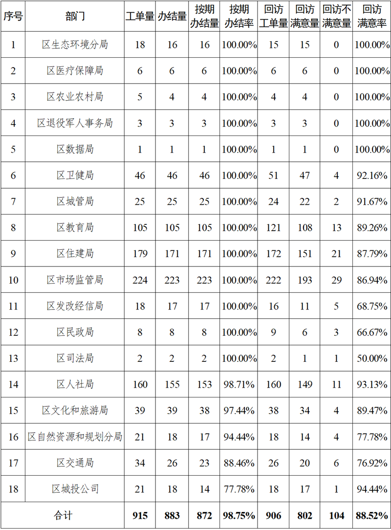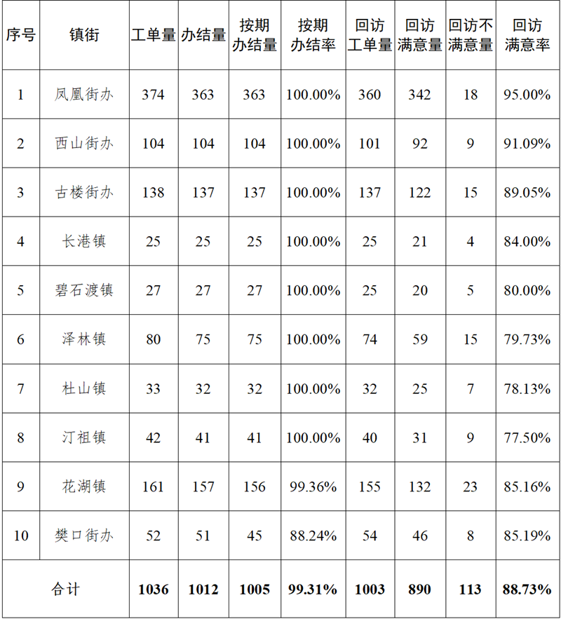 3月份,全区共接收工单1951件,按期办结率99.1%,回访满意率88.6%。对比上期,按期办结率上升0.7个百分点,回访满意率上升0.4个百分点。对比2025年3月份,接收工单量上升1.8个百分点,按期办结率上升0.5个百分点,回访满意率上升19.6个百分点。