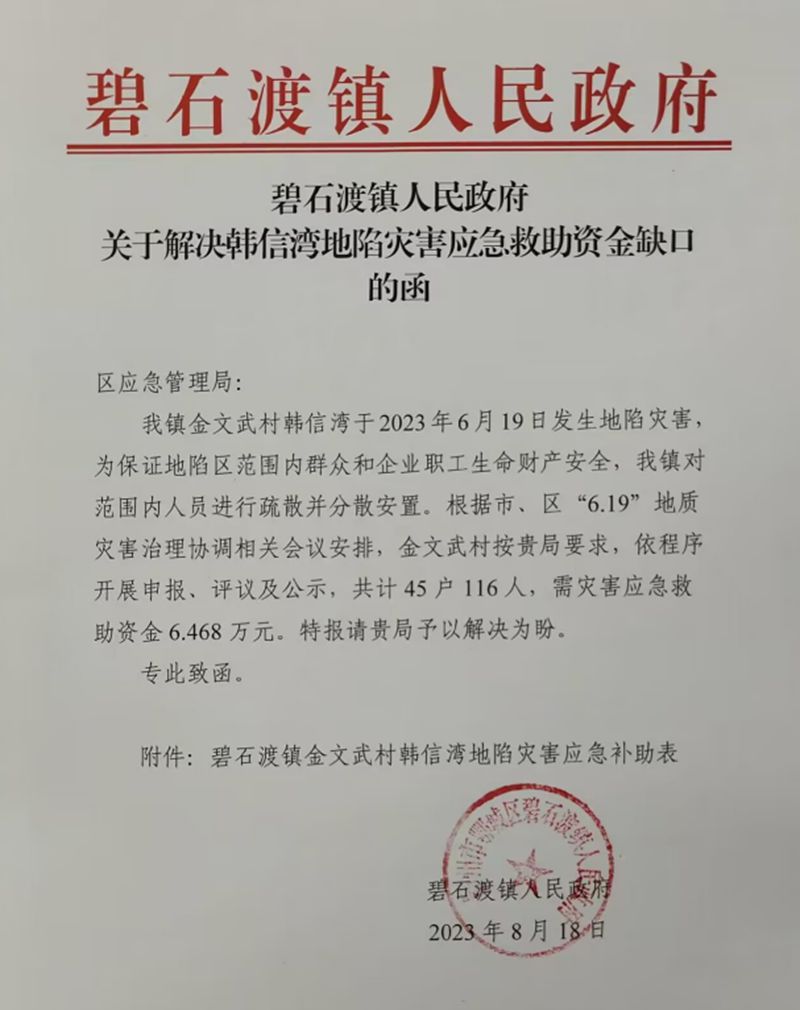 碧石渡镇人民政府关于解决韩信湾地陷灾害应急救助资金缺口的函