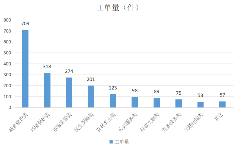 整体来看,本月工单数量环比下降8.7%,公众诉求总量呈现回落趋势。从工单类型分布看,城乡建设类问题占比进一步上升,该领域治理压力仍在增加。环境保护类、农林水土类与党务政务类占比小幅上升;市场监管、民生保障、公共服务、科教文旅及交通运输类占比出现不同程度下降。
