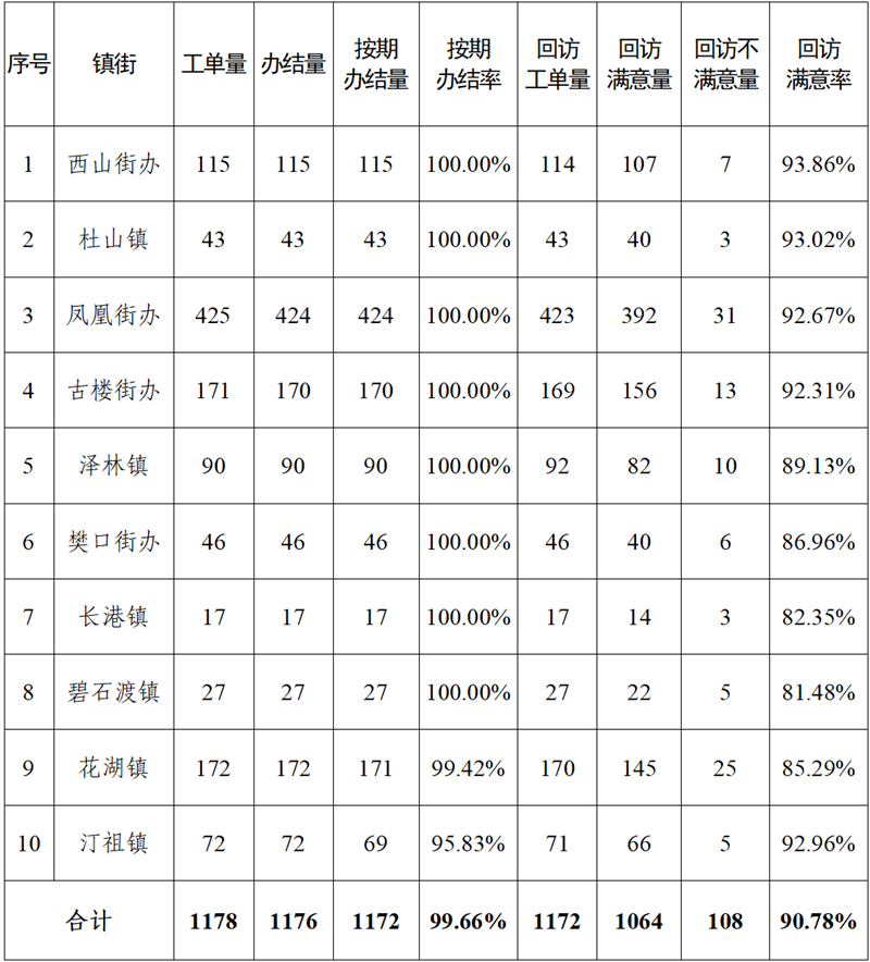 全区11月份共接收工单1997件,按期签收率100%,按期办结率99.3%,回访满意率89.6%。对比10月份,接收工单量下降9.631个百分点,按期办结率下降0.1个百分点,回访满意率上升0.3个百分点。对比2024年11月份,接收工单量下降26.1个百分点,按期办结率上升1.6个百分点,回访满意率上升18.9个百分点。
