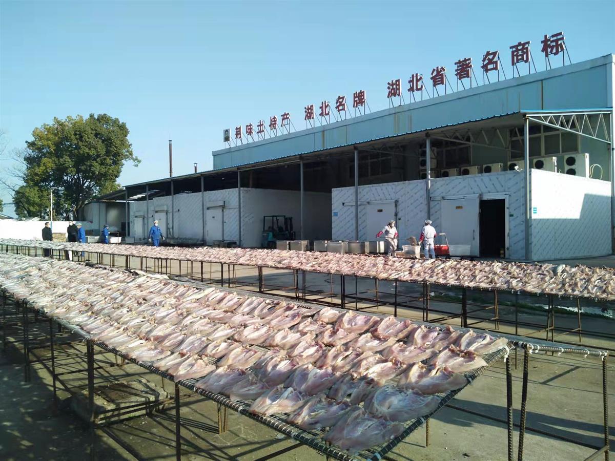 图为:湖北富农食品工业园趁冬日暖阳晒制腊鱼。(通讯员 彭易涛 摄)