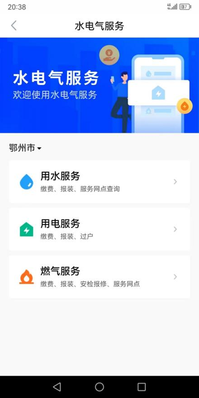 第二步:定位到鄂州市鄂城区选择水电气服务: