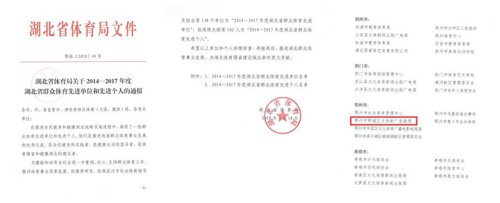 在推进全民健身和健康湖北战略实施过程中,鄂城区文体新广旅游局始终坚持“体育为民、体育惠民”,促进了全区群众体育事业的大发展,为建设现代化航空新城开了好局。鄂城区全民健身工作,探索出了新的经验,走出了新的路子,实现了弯道超越,并喜获2014——2017年度湖北省群众体育先进单位。