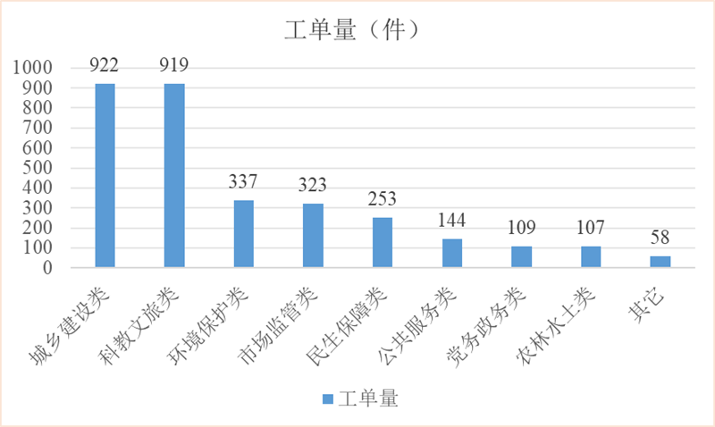 2025年9月份(截至9月30日),全区共接收市12345热线交办和转办工单3172件。按照内容划分,城乡建设类问题共922件,占比29.1%,较上月下降8.1个百分点;科教文旅类问题共919件,占比29%,较上月上升23.3个百分点;环境保护类问题共337件,占比10.6%,较上月上升2.3个百分点;市场监管类问题共323件,占比10.2%,较上月下降4.2个百分点;民生保障类问题共253件,占比8%,较上月下降4.6个百分点;公共服务类问题共144件,占比4.5%,较上月下降3.5个百分点;党务政务类问题共109件,占比3.4%,较上月下降0.2个百分点;农林水土类问题共107件,占比3.4%,较上月下降3个百分点;剩余58件主要反映交通运输、公共安全等方面的问题,占比1.8%,较上月上升0.7百分点。具体见下表:
