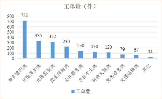 2025年10月份(截至10月31日),全区共接收市12345热线交办和转办工单2188件。按照内容划分,城乡建设类问题共721件,占比32.9%,较上月上升3.8个百分点;环境保护类问题共335件,占比15.3%,较上月上升4.7个百分点;市场监管类问题共322件,占比14.7%,较上月上升4.5个百分点;民生保障类问题共230件,占比10.5%,较上月上升2.5个百分点;公共服务类问题共150件,占比6.9%,较上月上升2.4个百分点;农林水土类问题共130件,占比5.9%,较上月上升2.5个百分点;科教文旅类问题共120件,占比5.5%,较上月下降23.5个百分点;党务政务类问题共79件,占比3.6%,较上月下降0.2个百分点;交通运输类问题共67件,占比3.1%;剩余34件主要反映公共安全、医疗卫生等方面的问题,占比1.5%,较上月下降0.3个百分点。具体见下表: