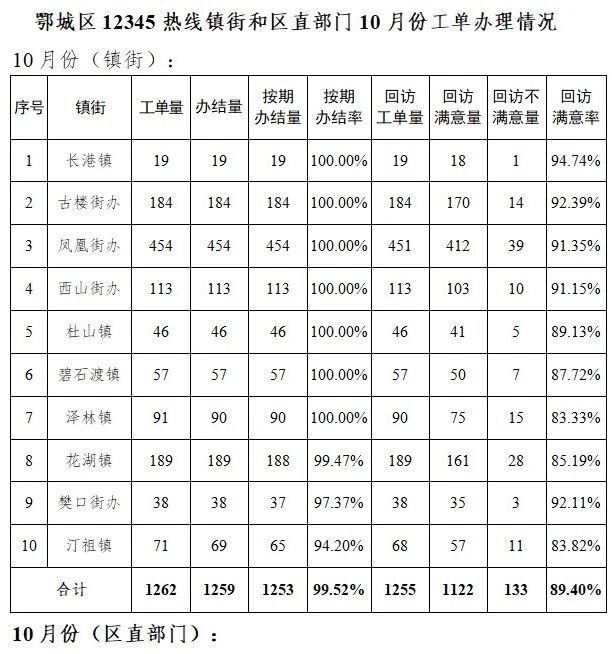 全区10月份共接收工单2188件,按期签收率99.7%,按期办结率99.4%,回访满意率89.3%。对比9月份,接收工单量下降31个百分点,按期办结率上升0.1个百分点,回访满意率下降4.1个百分点。对比2024年10月份,接收工单量下降19.2个百分点,按期办结率上升1.2个百分点,回访满意率上升15.9个百分点。