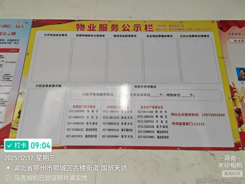 为回应广大群众对物业服务的诉求和期盼,提高物业服务管理质量,按照省、市工作部署要求,鄂州市鄂城区启动实施物业管理服务“红黑榜”机制。此次集中对交付年限在10-15年内的住宅物管小区开展检查评价,突出小区消防安全检查,以及前期小区信访投诉及现场巡查情况,经过综合研判和评估,现发布2025年鄂城区物业管理服务第十一期“红黑榜”。