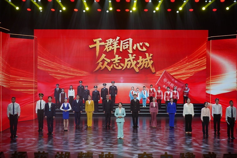 最后,市融媒体中心记者刘琴与塔吊司机、顺丰员工、警察代表、志愿者代表、学生代表等一同登台,展现不同岗位上的精神践行,将现场气氛推向高潮,掌声经久不息。