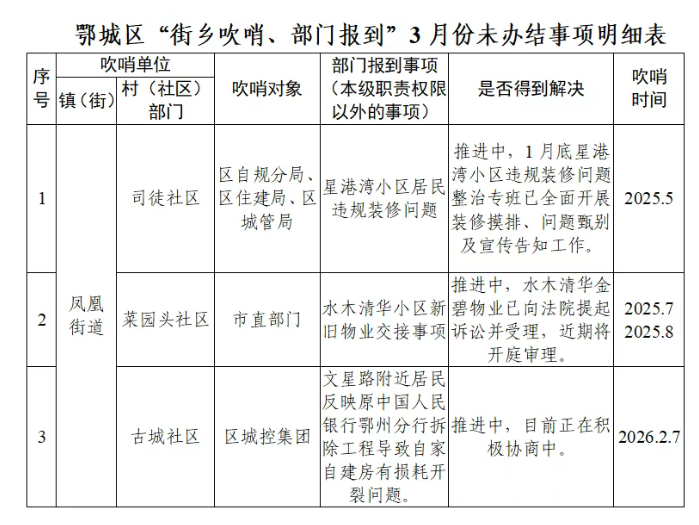 2026年3月份,全区各镇街向部门共计吹哨111次,其中向市直部门吹哨45次,向区直部门吹哨66次,办结事项108次(市直部门办结44次,区直部门办结64次),办结率为97.3%,3项未办结。