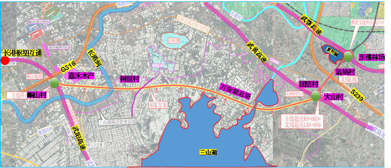 根据设计方案,主线长11.192公里,设置枢纽互通式立交2处、监控分中心1处,同步建设支线1处,支线起于主线起点,止于东佛林场衔接S7武鄂高速公路,长2.190公里,设置枢纽互通式立交1处。整个路线合计里程13.382公里,将建设包括主线桥梁、互通立交、涵洞等一系列设施,具体包括主线桥15座、涵洞7道,并设置3处互通式立交。