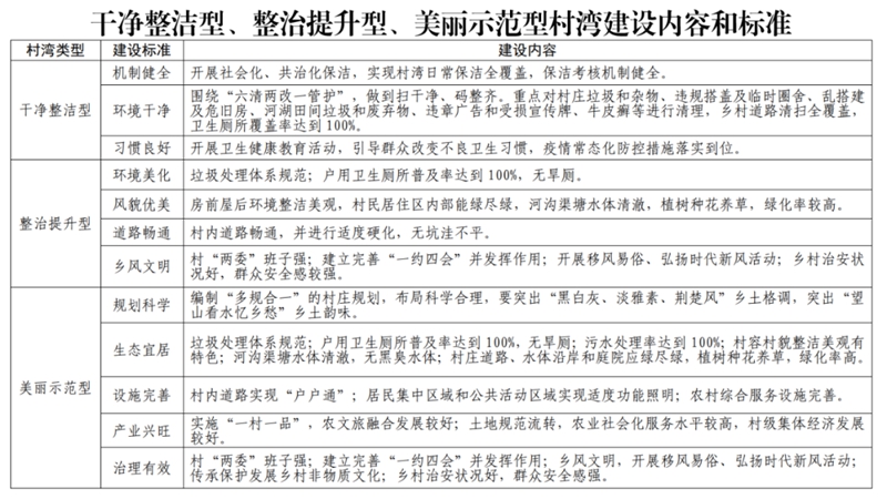 2.干净整洁型、整治提升型、美丽示范型村湾建设内容和标准。