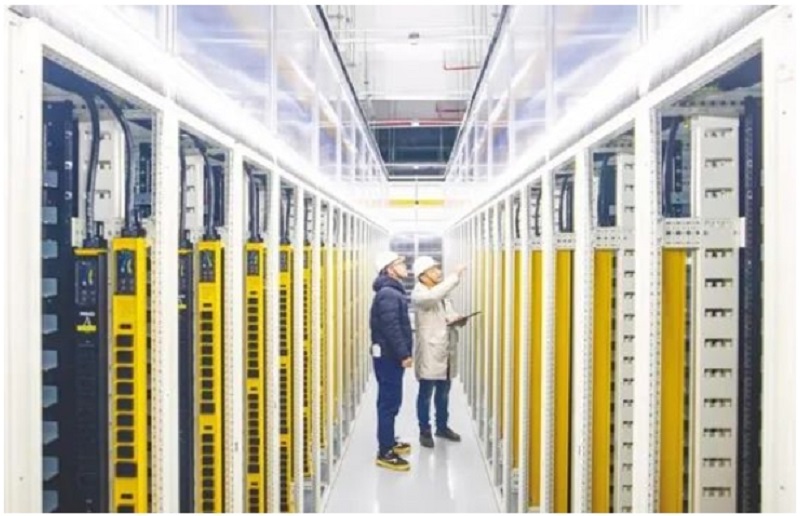 工作人员在悦科(湖北)数据中心项目调试设备。