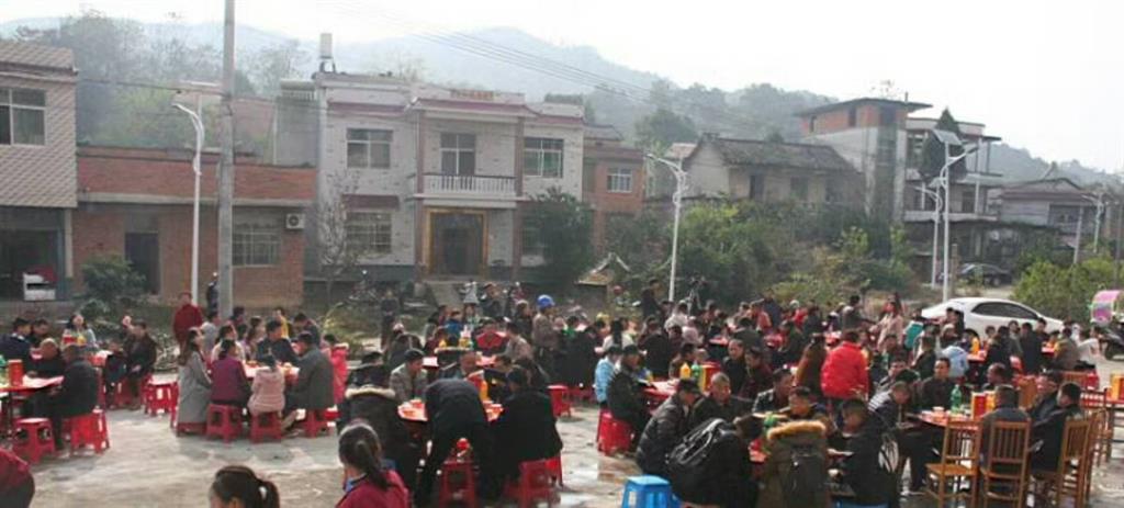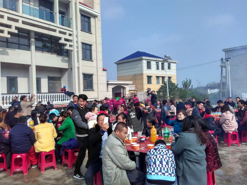 12点28分,童家坝乔迁宴开始,阳光下的民院里,20多桌一字摆开,烟花爆竹放了十多分钟,乡亲们个个笑容满面。鄂城区机场征迁摄影组的周园林说:"童家坝湾今天参加乔迁宴的,有的是从新疆赶回来的,有的是从北京大学回来的。湾里4个80多岁的老人全部到齐。"黄山村党支部书记袁广给出了一个准确数字:"10组220多人,今天回了212人,过年都没有回来这么齐。”