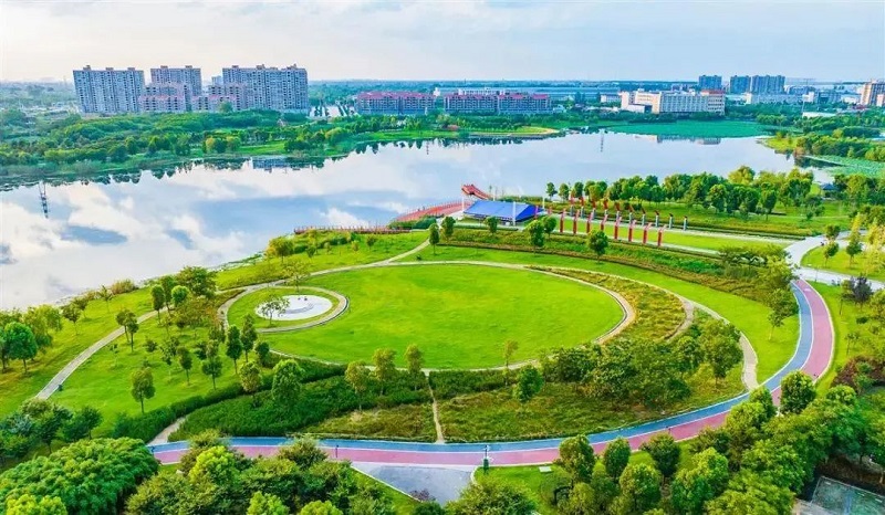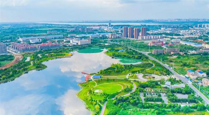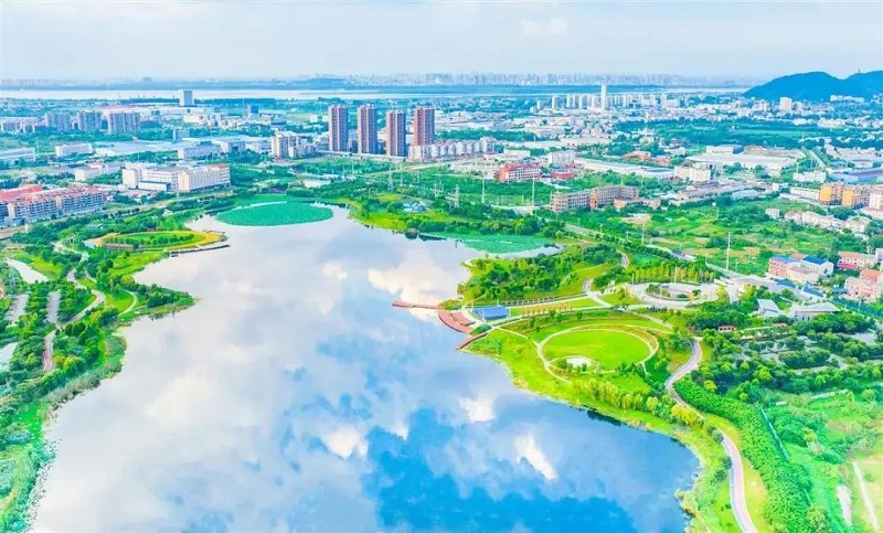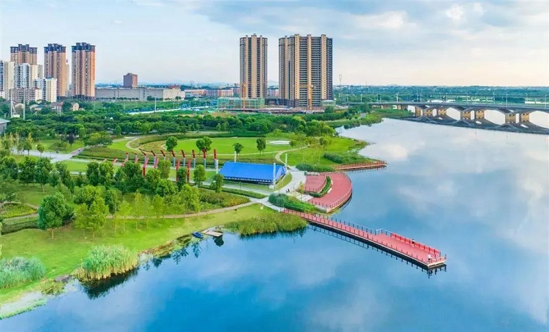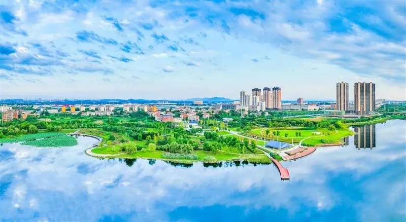 7月17日,鄂州青天湖湿地公园水清岸绿,在蓝天白云的映衬下,美不胜收。